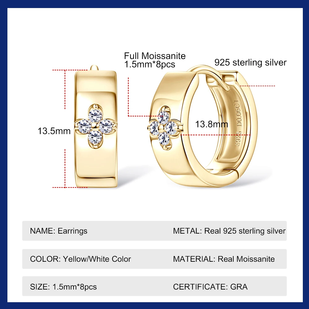 1.5mm Full Moissanite Hoop Earrings for Women Girls Jewelry Lab Diamond Clover Earring 925 Sterling Silver Jewelry