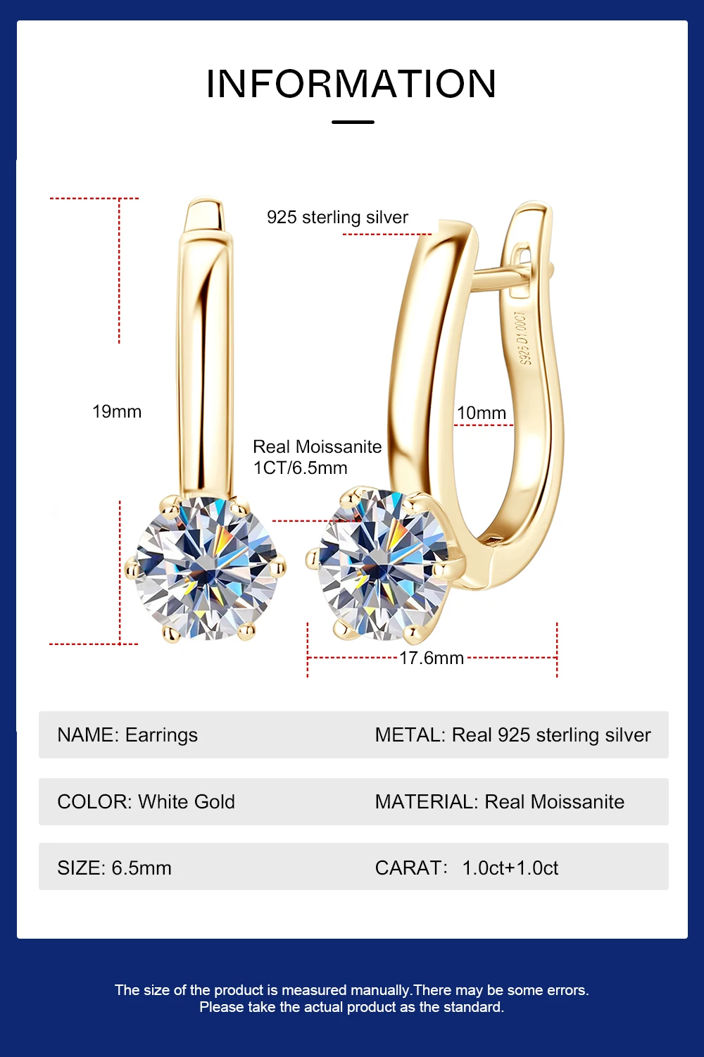 These sophisticated moissanite earrings blend premium craftsmanship with exceptional value. Constructed from 925 sterling silver and finished with 18K gold plating, they feature certified 6.5mm moissanite stones renowned for their diamond-like brilliance and durability. The classic hoop ear clip design provides secure, comfortable wear suitable for daily use or special occasions. Each pair comes certified, ensuring authenticity and quality you can trust. An ideal choice for those seeking luxury gemstone jewelry with lasting appeal.