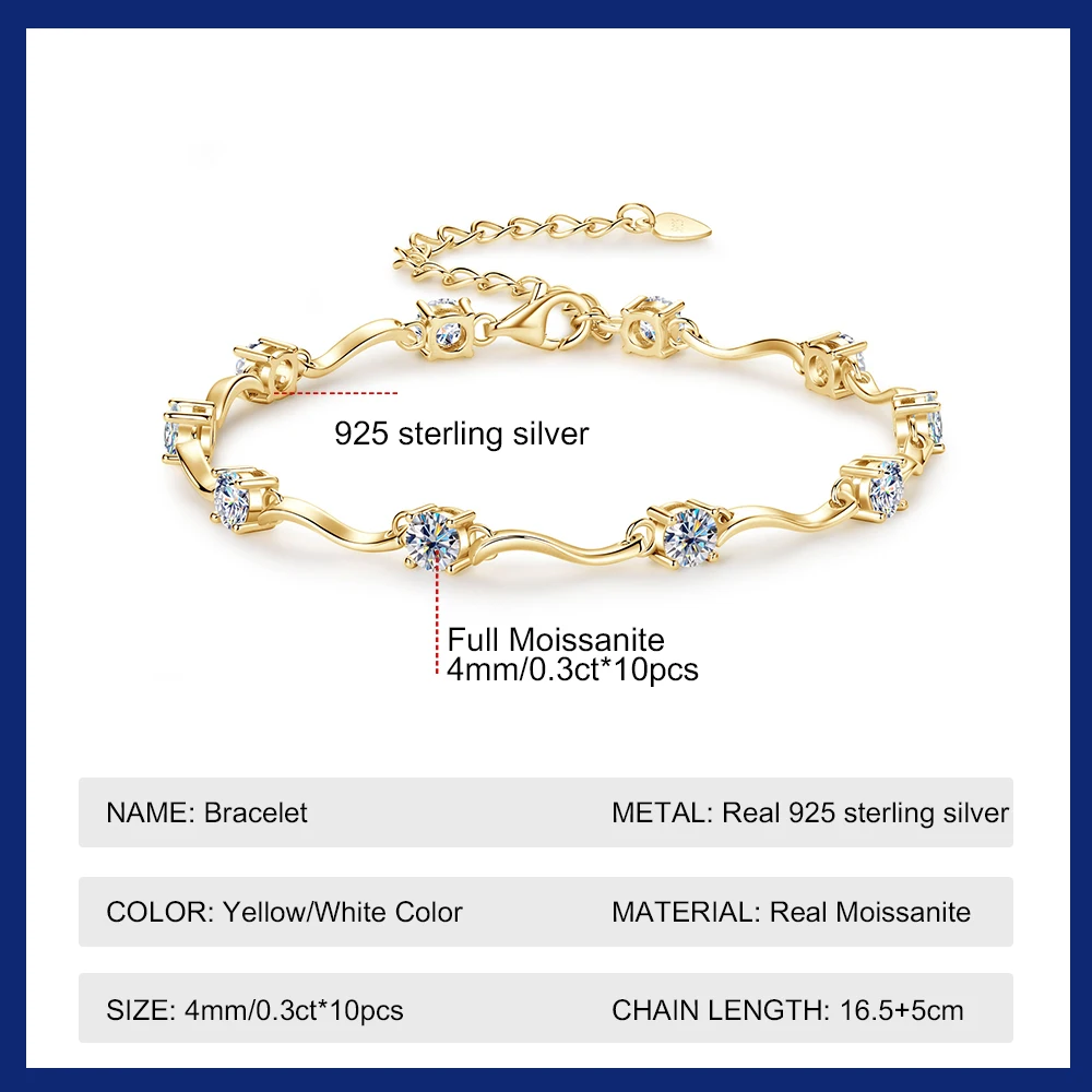 18K Plated 4mm Full Moissanite Bracelets for Women GRA Certified 3CT Lab Diamond Bracelet 100% Real Silver Chain 925
