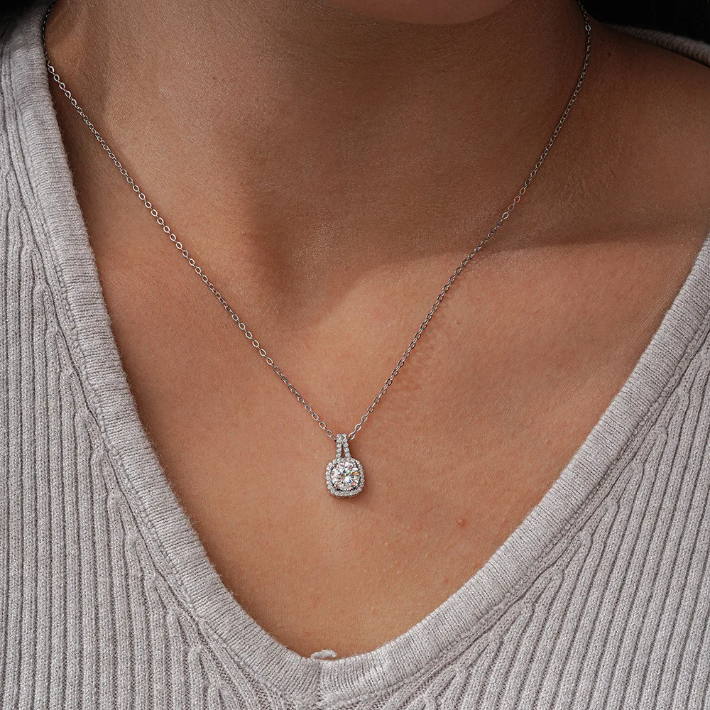 This exquisite pendant necklace showcases a radiant 1-carat moissanite stone set in a sleek square silhouette, masterfully crafted from 18k white gold and platinum (Pt950). The combination of precious metals ensures lasting brilliance and durability, while the moissanite's exceptional sparkle rivals traditional diamonds. Designed for the discerning woman who appreciates fine craftsmanship, this versatile piece transitions seamlessly from boardroom to evening events. A statement accessory that embodies timeless luxury and refined taste.
