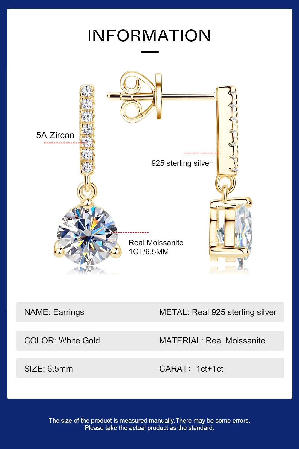 1CT Certified Moissanite Drop Earrings for Women Platinum Plating 925 Sterling Silver 3- Claw Diamond Ear Stud Wedding Jewelry