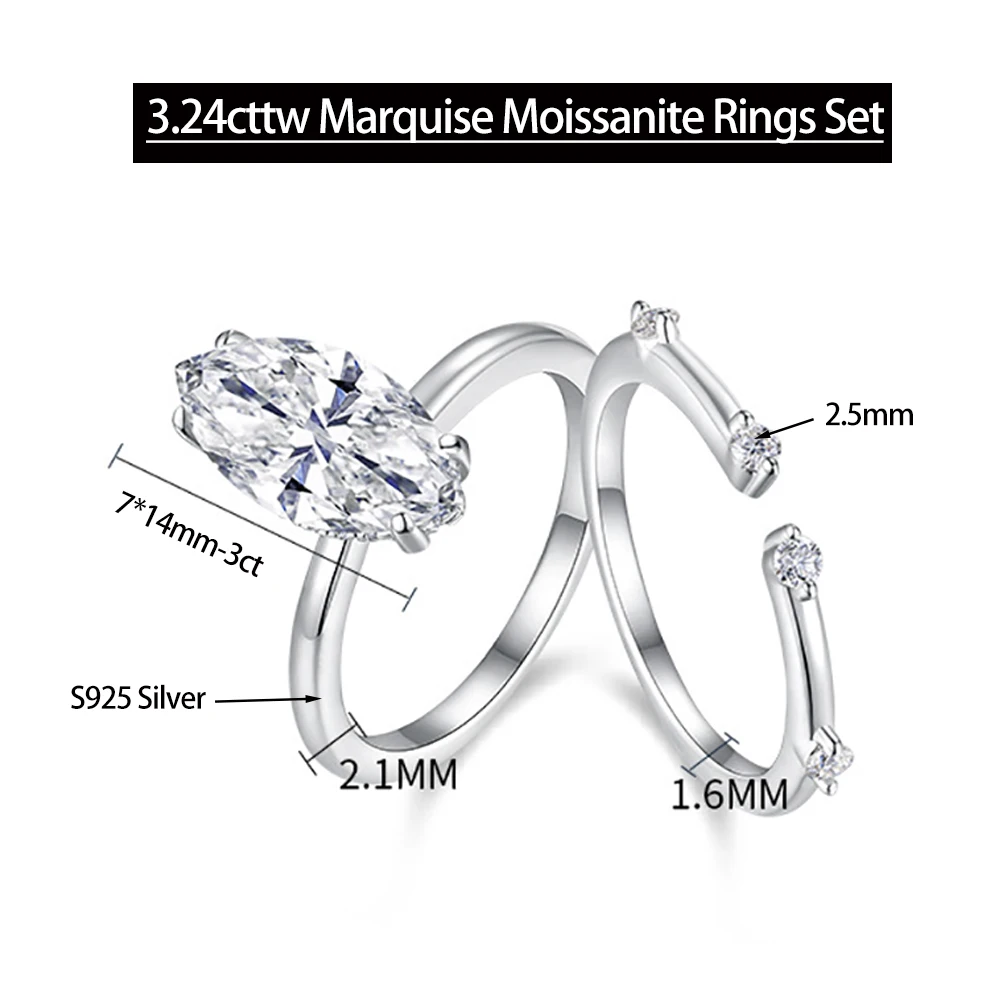 3ct Marquise D Color Moissanite Rings Set for Women Wedding Bridal 100% S925 Sterling Silver Eternity Rings Plated 18K