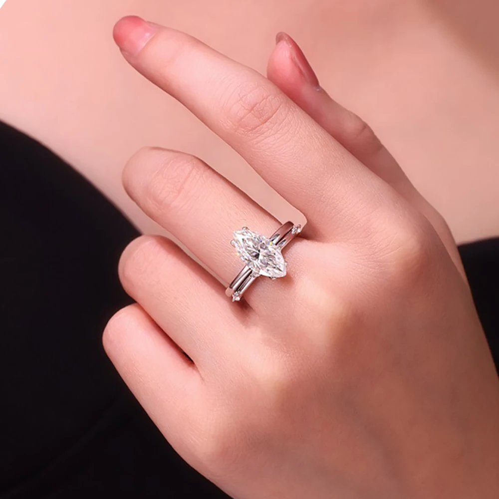 This exquisite 3ct marquise-cut D color moissanite ring set is crafted for discerning brides seeking lasting elegance. Each eternity ring is forged from 100% S925 sterling silver and finished with an 18K plating for enhanced durability and a luxurious shine. The brilliant moissanite stones offer exceptional fire and brilliance, closely resembling diamonds while providing superior affordability. Perfectly designed for wedding or bridal wear, this set combines timeless style with expert craftsmanship to symbolize your eternal commitment.