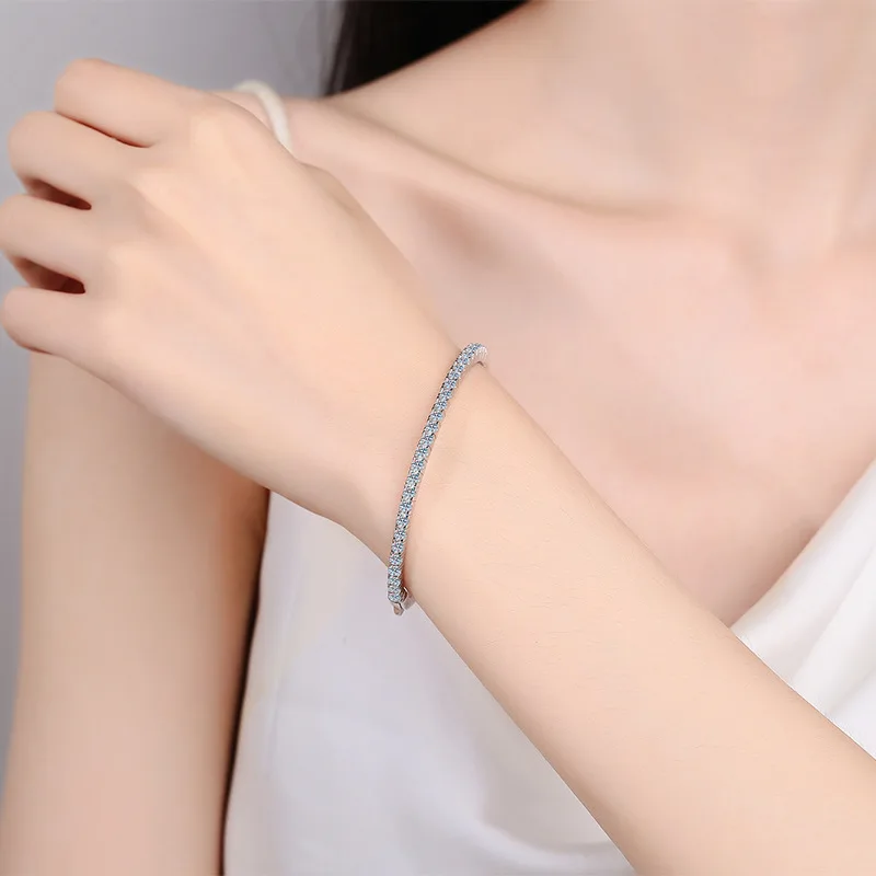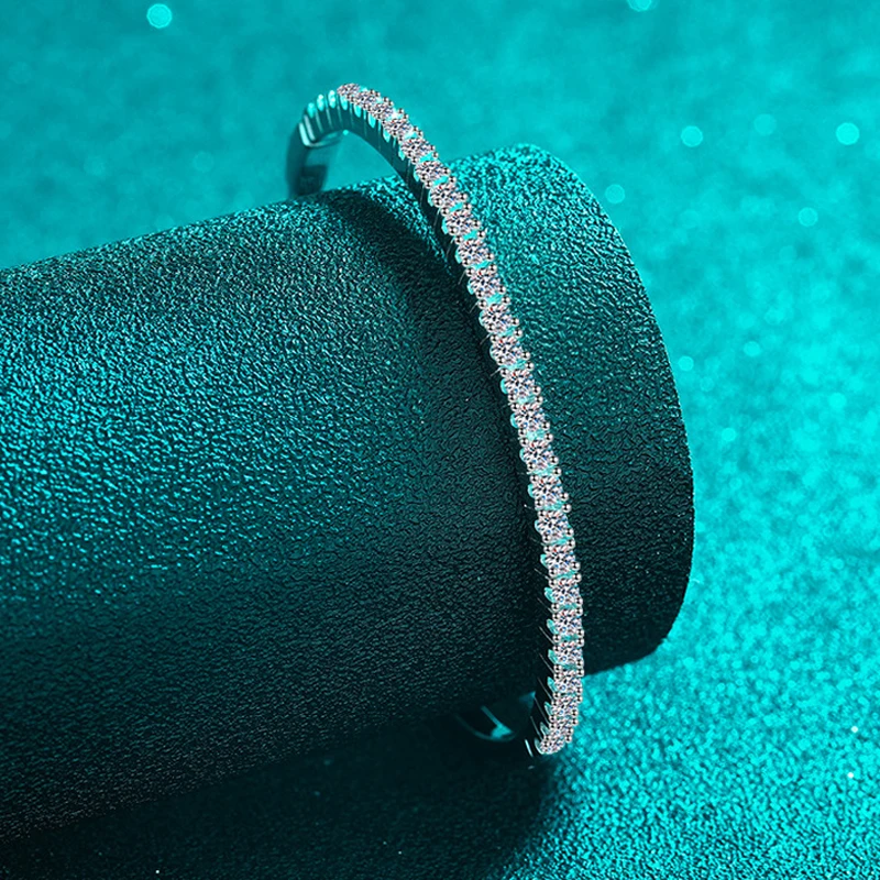 Discover the perfect blend of luxury and value with these exquisite moissanite bangles. Featuring brilliant 2.5mm stones set in 925 sterling silver with 18K gold plating, these bracelets radiate sophistication and timeless elegance. Whether celebrating a milestone or treating yourself, moissanite offers exceptional sparkle and durability without the premium price tag. Each bangle is a statement piece—versatile enough for daily wear yet stunning enough for special occasions. Invest in jewelry that truly shines.