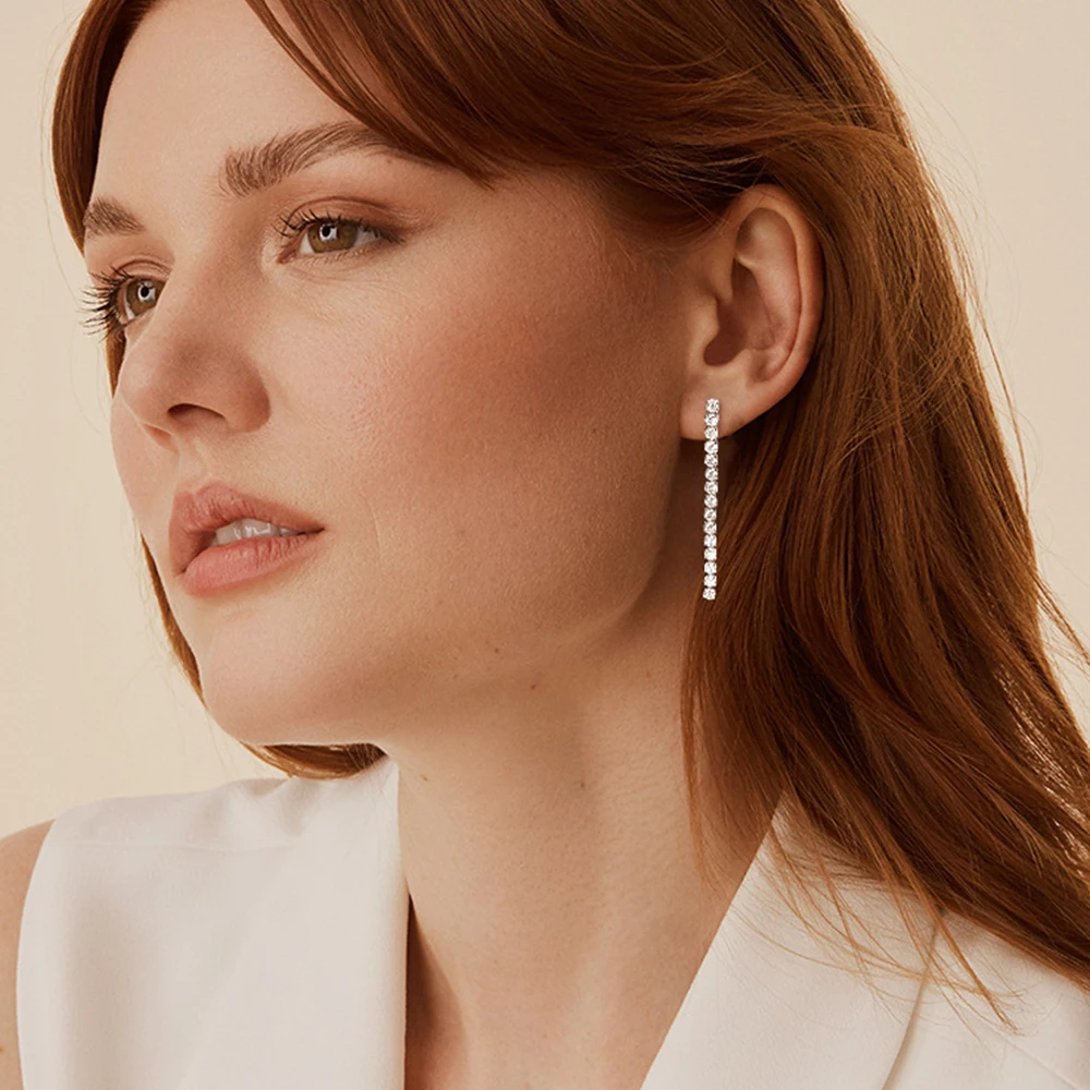 These elegant dangle earrings feature brilliant 2.5mm moissanite stones set in authentic 925 sterling silver with your choice of gold or silver finish. The long tassel design creates a graceful, elongated silhouette that catches light beautifully with every movement. Perfect for special occasions, weddings, or elevated everyday wear, these earrings combine timeless sophistication with modern sparkle. The moissanite gemstones offer exceptional brilliance and durability, while the quality sterling silver ensures lasting wear. An ideal choice for those seeking luxury-quality jewelry with distinctive style and versatility.