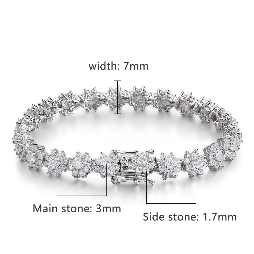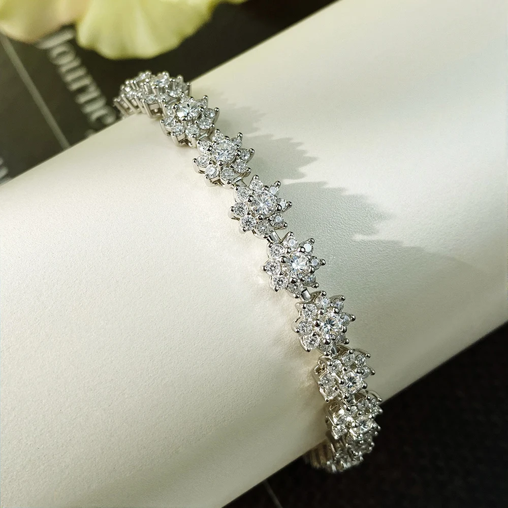 This Flower Moissanite Tennis Bracelet represents sophisticated bridal jewelry crafted with precision and quality materials. The piece combines 925 sterling silver with 18k white gold plating, creating a lustrous foundation for the stunning moissanite stones. Each flower motif showcases brilliant gemstones that rival diamond sparkle while offering exceptional value. GRA certified moissanite ensures authenticity and superior optical performance. The classic tennis bracelet design provides versatile styling—equally striking as a wedding accessory or refined everyday piece. Engineered for durability and comfort, this bracelet suits both women and men seeking luxury jewelry that transcends occasion. The secure setting and premium materials guarantee lasting brilliance and wearability for years to come.