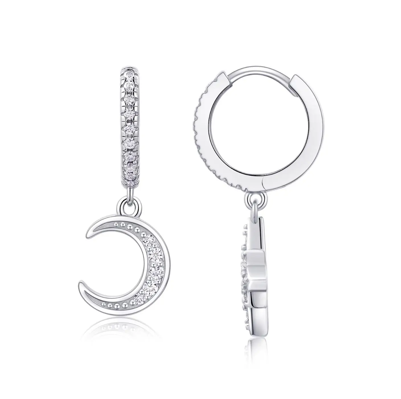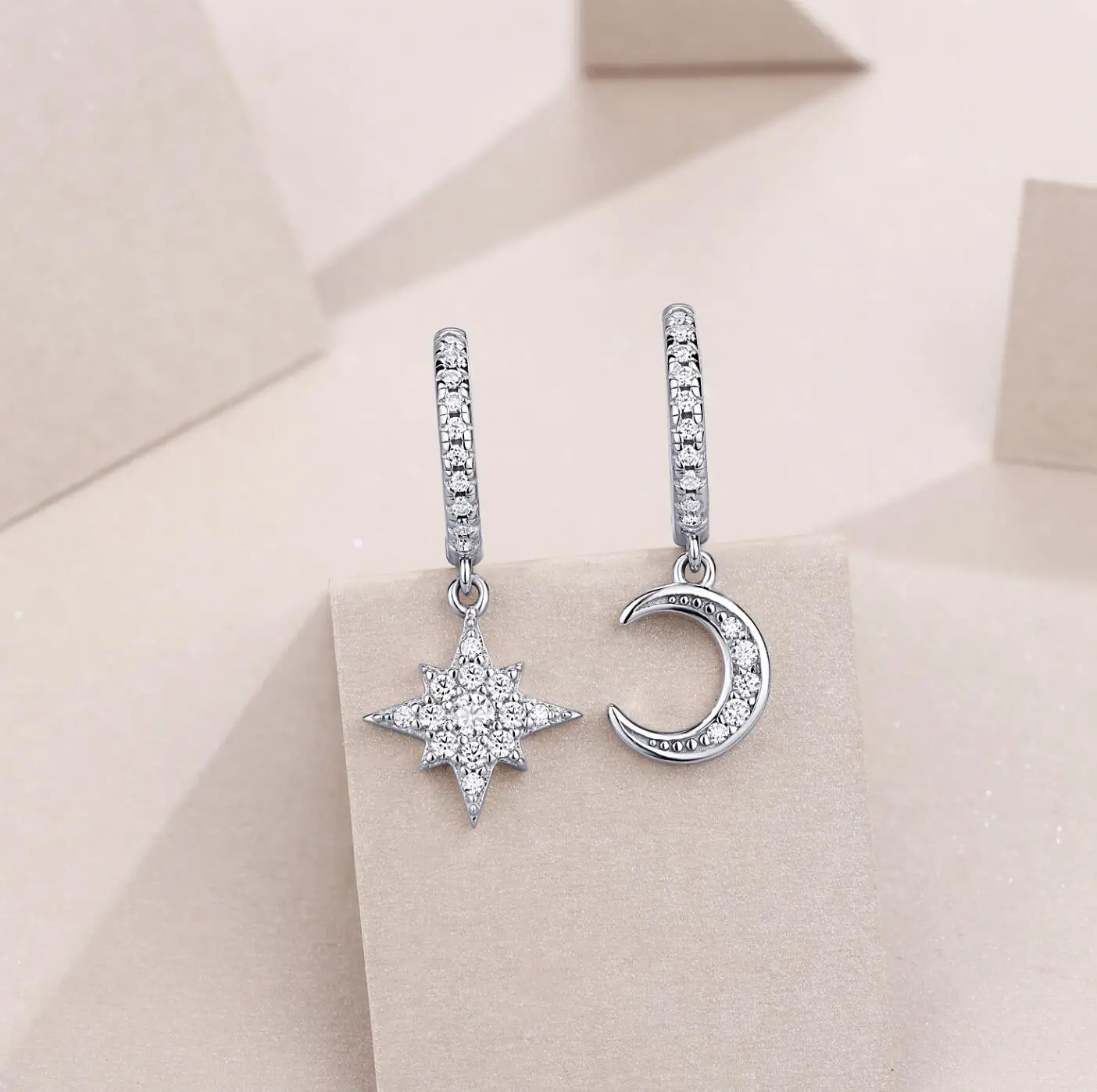 These asymmetric hoop earrings combine celestial elegance with modern sophistication. Crafted from 925 sterling silver, they feature full moissanite stones that deliver brilliant sparkle and exceptional durability. The star and moon design creates a distinctive look perfect for parties, special occasions, or everyday wear. Moissanite offers superior clarity and fire compared to traditional gemstones, while remaining more affordable. Ideal for women and girls seeking statement jewelry that balances style with lasting quality.