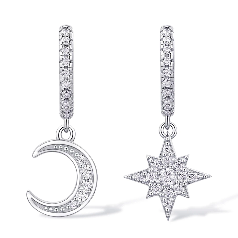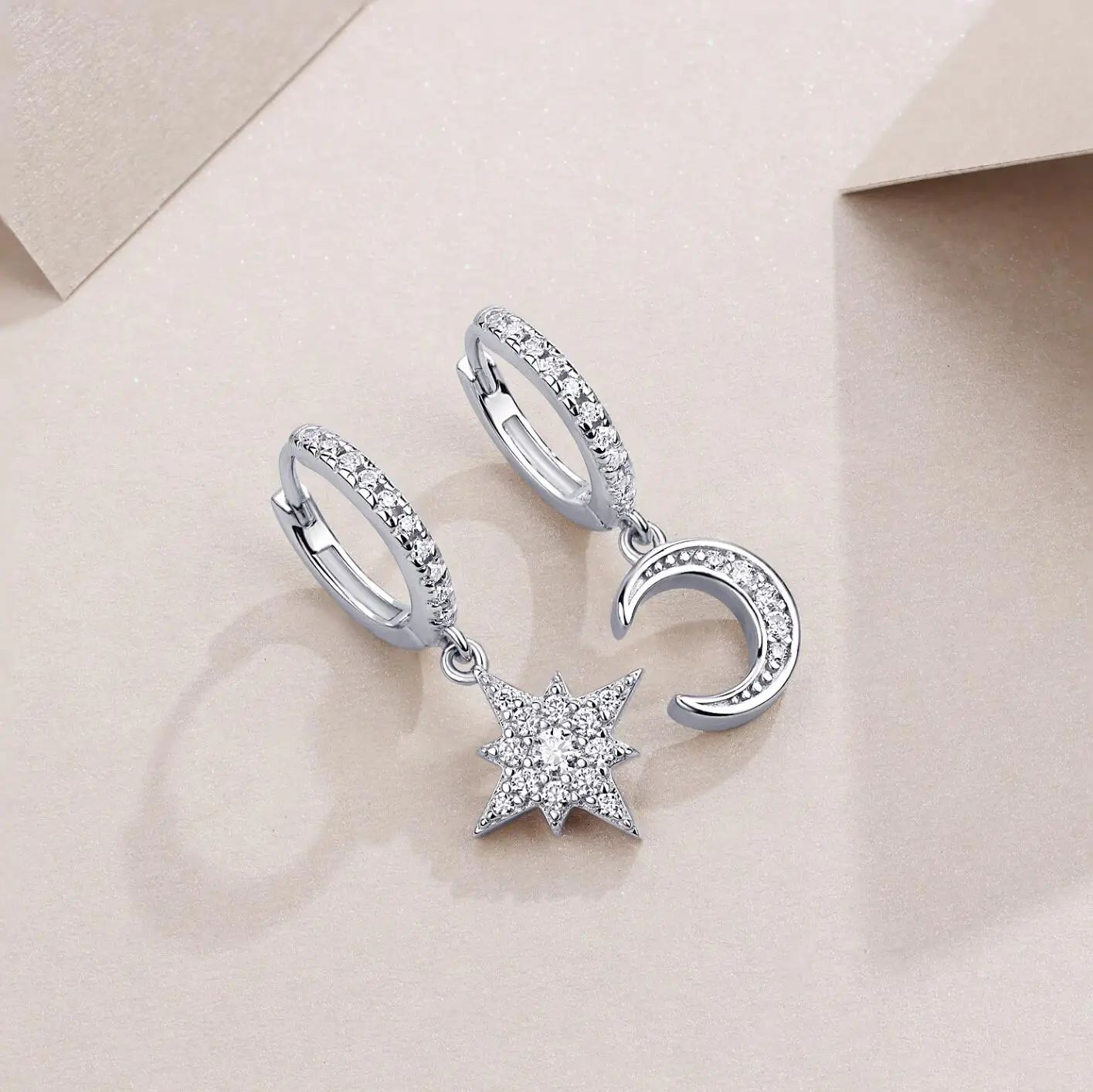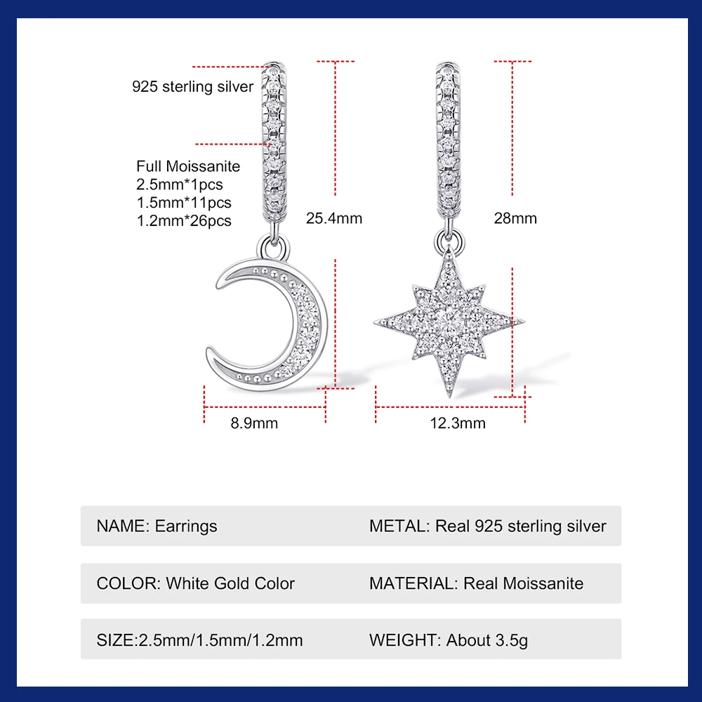 Full Moissanite Earrings 925 Sterling Silver Star Moon Asymmetric Hoop Earrings for Women Girls Party Jewelry Gifts