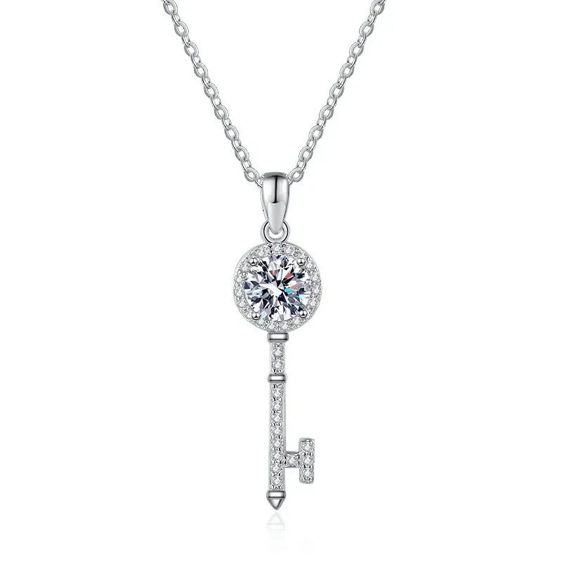 Discover refined luxury with this exquisite 1 carat D color moissanite necklace, a sophisticated choice for the modern woman. Featuring an iconic key pendant symbolizing elegance and empowerment, this piece showcases premium moissanite's unmatched brilliance and fire. Set in authentic S925 sterling silver, it combines durability with timeless beauty. Moissanite offers exceptional value—delivering diamond-like sparkle with superior durability and ethical sourcing. Whether you're treating yourself or selecting a meaningful gift, this necklace makes an unforgettable statement. Versatile enough for daily wear yet striking enough for special occasions, it's the perfect addition to any jewelry collection.
