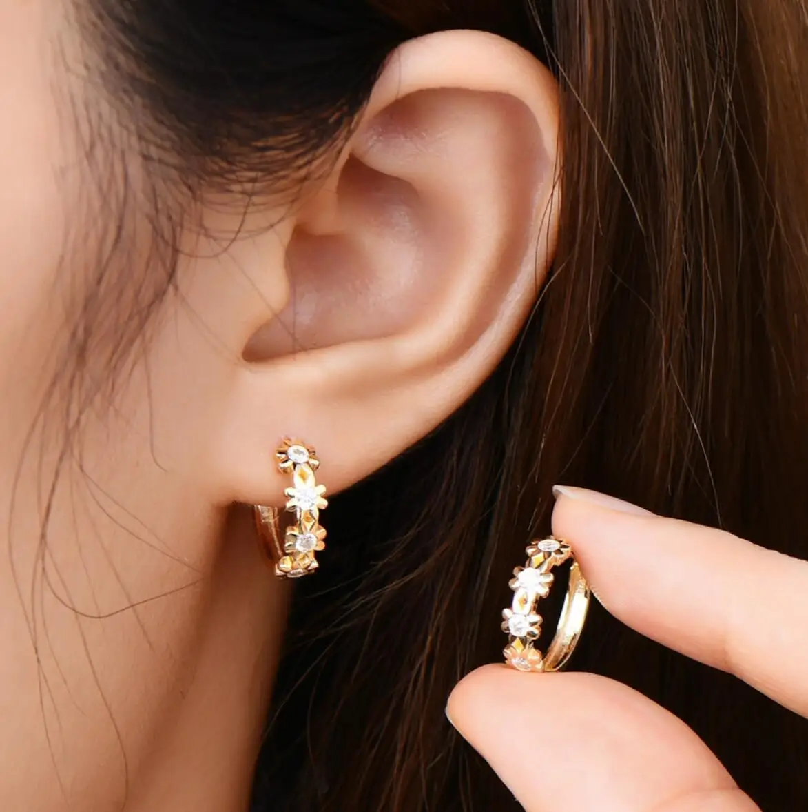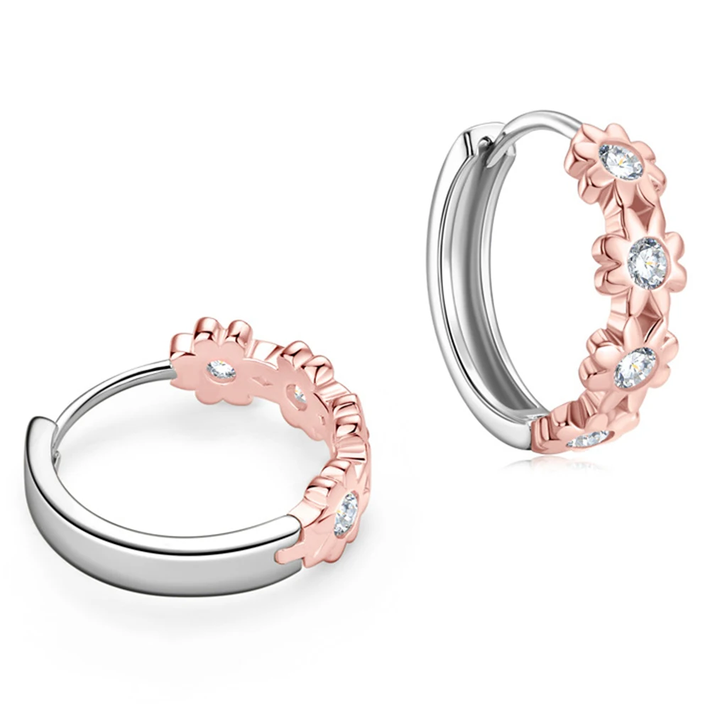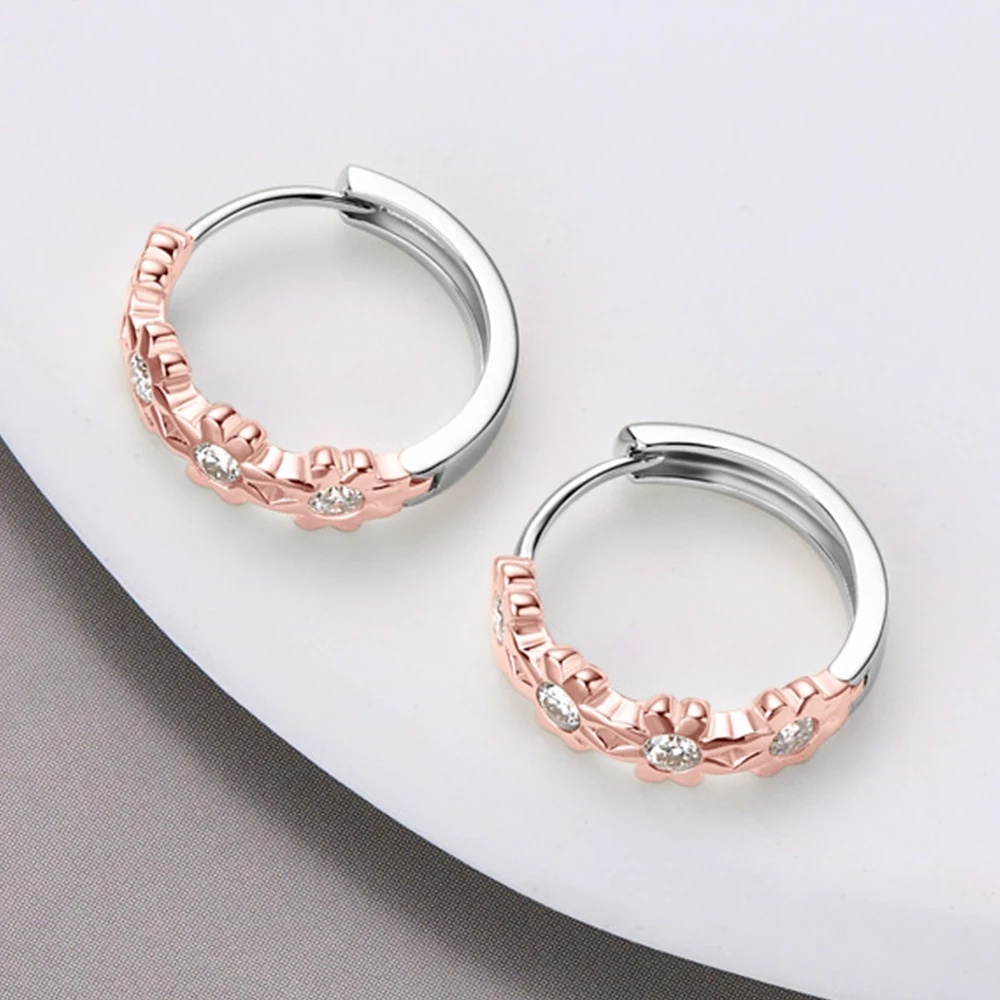 Elevate your everyday elegance with these rose gold hoop earrings, featuring brilliant 2.2mm moissanite stones that capture light with exceptional sparkle. Crafted from authentic 925 sterling silver, these piercing earrings combine durability with sophisticated style. The delicate flower design adds a refined touch, making them versatile enough for casual wear yet polished enough for special occasions. Perfect for those seeking timeless jewelry that delivers both beauty and lasting quality.