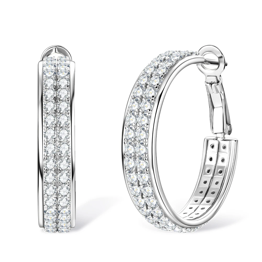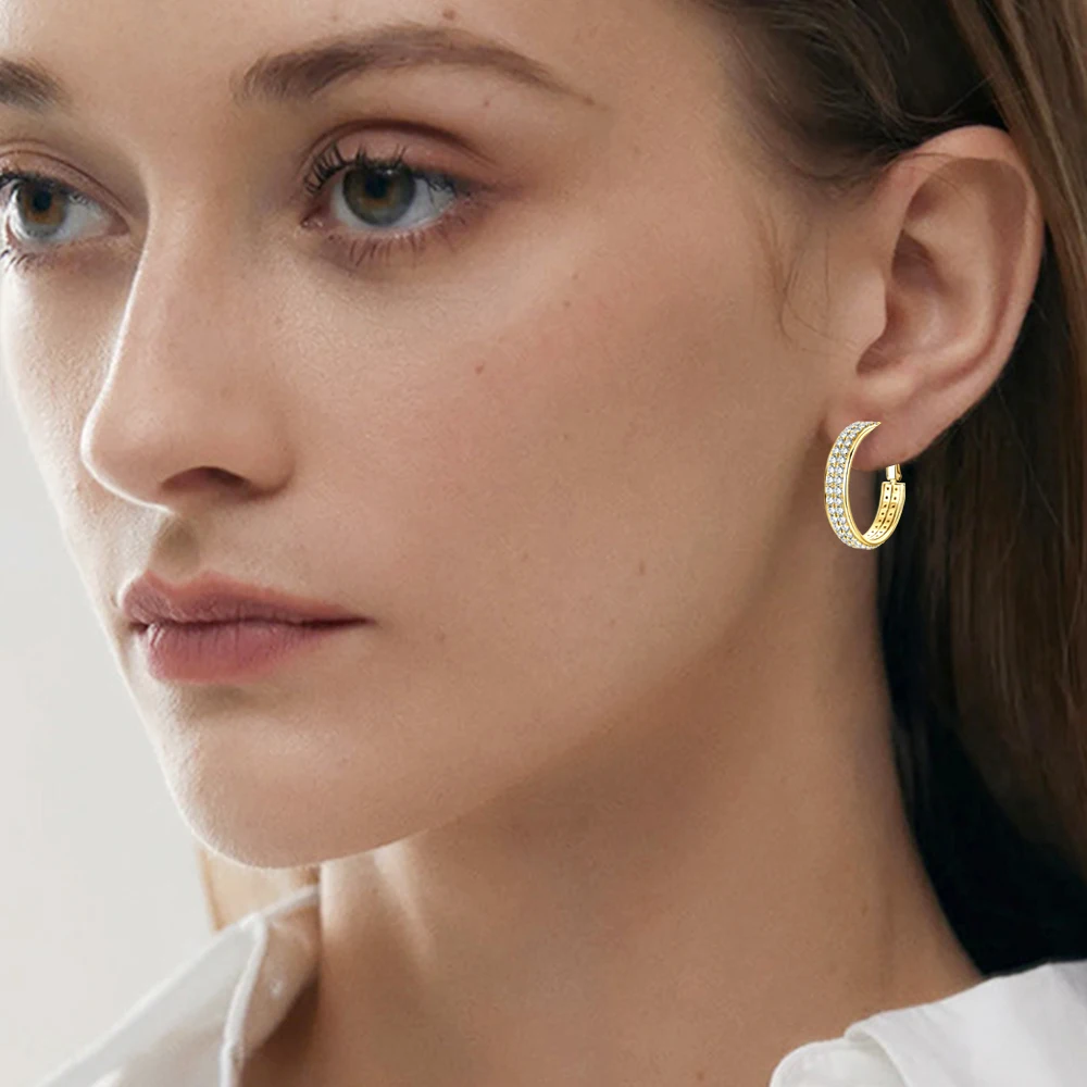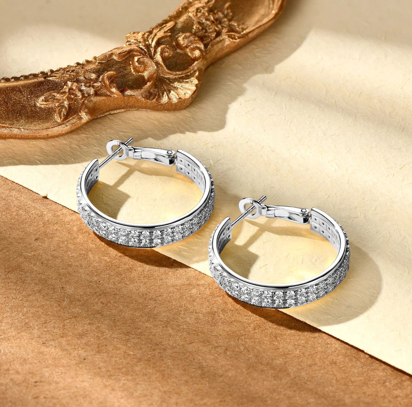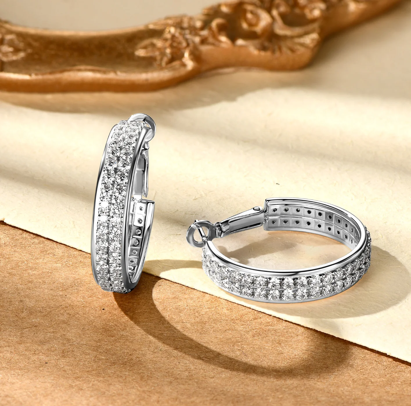 These elegant hoop earrings feature lab-created moissanite stones cut to maximize sparkle and brilliance. Crafted from S925 sterling silver with 18k gold plating, they offer the luxury look of fine jewelry with exceptional durability. The 1.9mm moissanite delivers impressive light performance and fire, making them perfect for weddings, special occasions, or everyday elegance. A sophisticated choice for women seeking timeless style with modern gemstone technology.