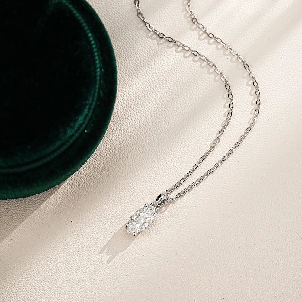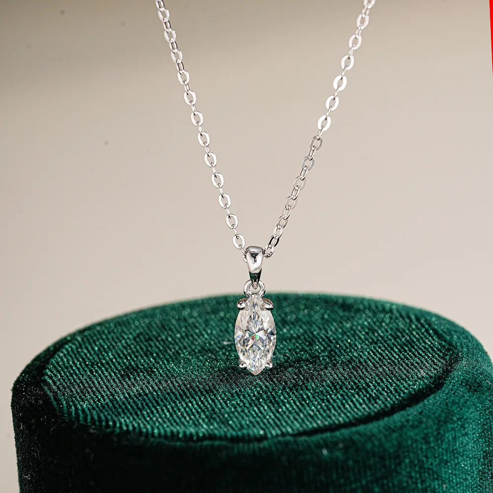 Elevate your elegance with this striking horse eye moissanite pendant, a bold statement piece that commands attention. Crafted in luxurious 18k white gold and platinum Pt950, this 1-carat necklace combines timeless sophistication with contemporary edge. The distinctive marquise-cut moissanite sparkles with unmatched brilliance, while the refined collarbone chain ensures a flattering, graceful drape. Perfect for women who refuse to compromise on quality or style, this fine jewelry piece transitions seamlessly from everyday glamour to red-carpet ready. A daring choice for those who celebrate their individuality.