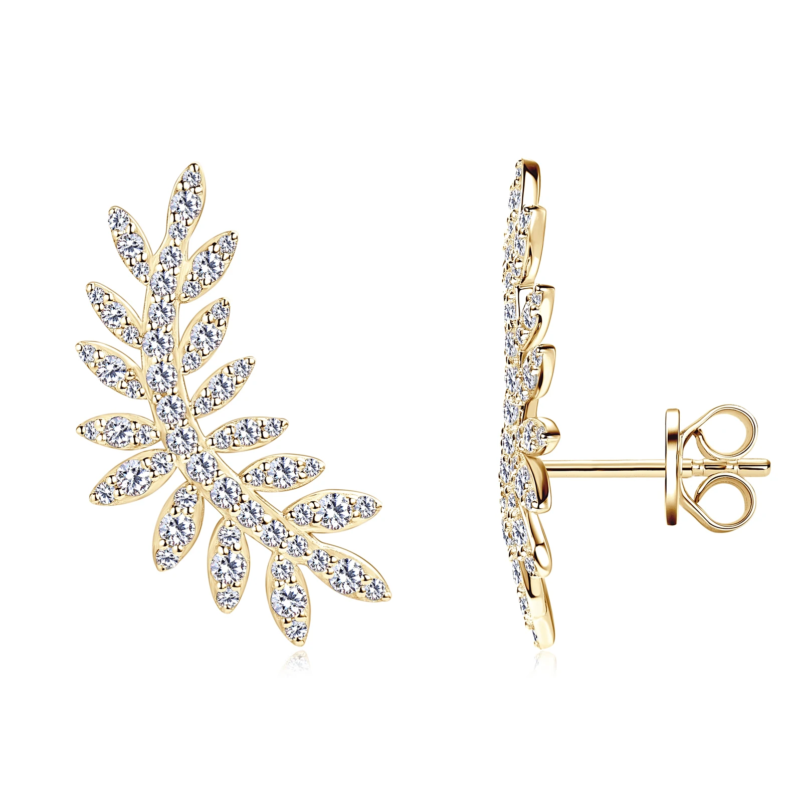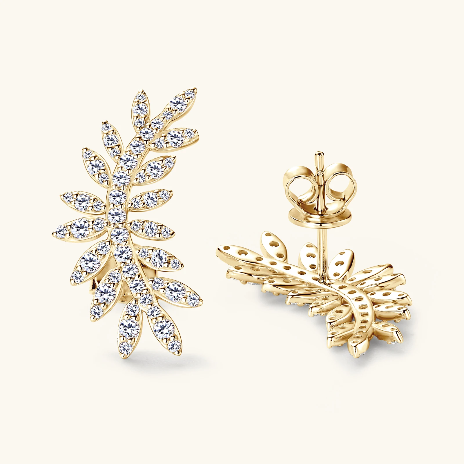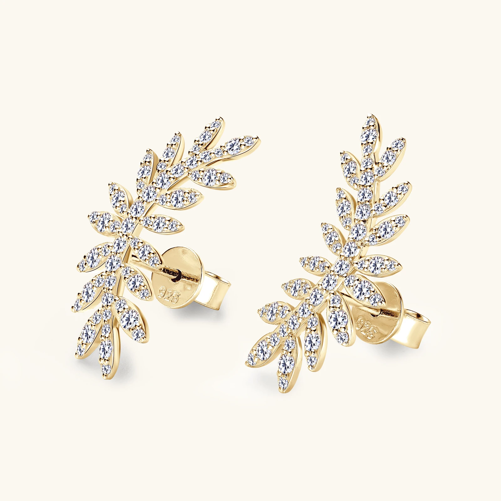 Elevate your everyday elegance with these sophisticated leaf moissanite stud earrings. Crafted from hypoallergenic S925 sterling silver with luxurious 14K yellow gold plating, these ear climbers combine timeless design with modern comfort. The brilliant moissanite stones catch light beautifully, offering diamond-like sparkle at a fraction of the cost. Perfect for sensitive skin, these versatile studs transition seamlessly from office to evening wear, making them an essential addition to any jewelry collection.