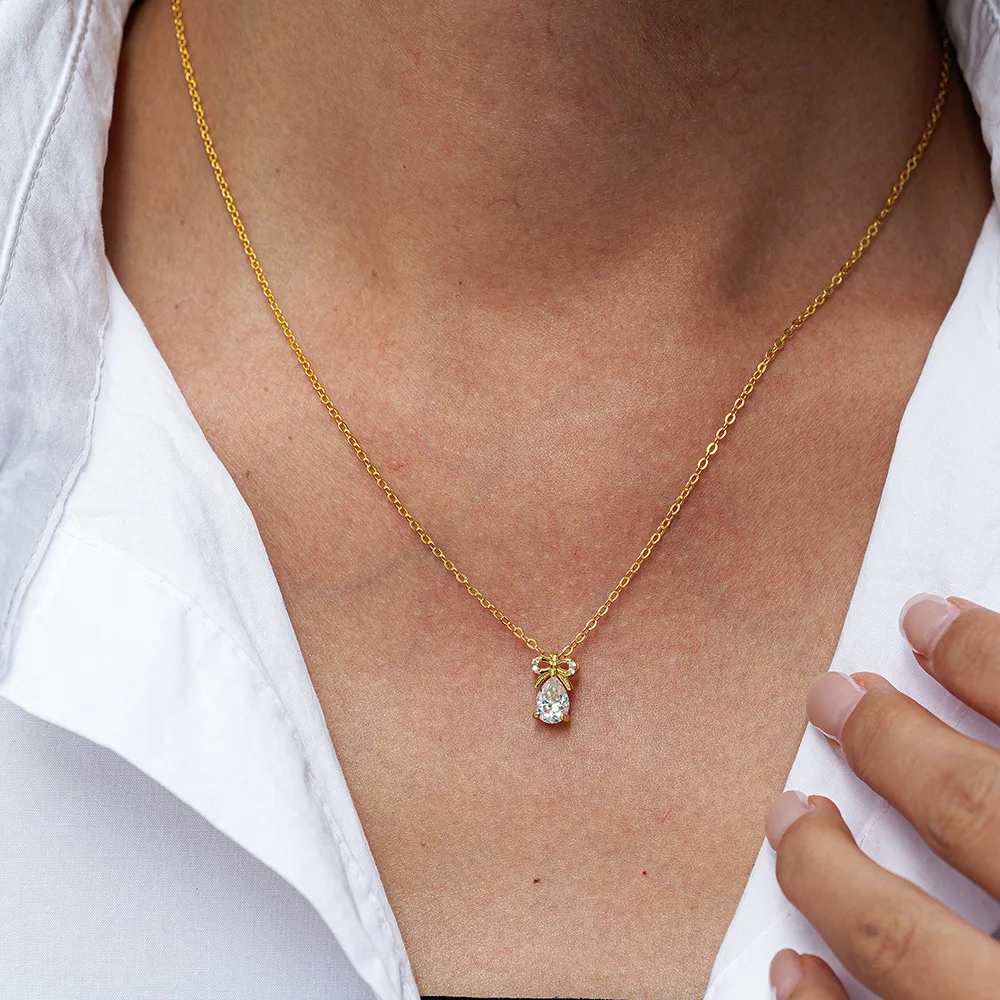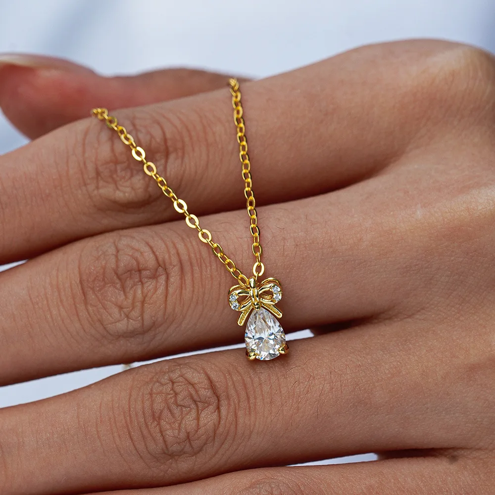 Discover timeless elegance with this stunning bow drop pendant, expertly fashioned in 14K gold. The 0.8ct moissanite stone delivers exceptional brilliance and clarity, rivaling traditional diamonds with remarkable fire and sparkle. Its graceful bow silhouette embodies refined femininity, making it an impeccable choice for weddings, engagements, or as a cherished heirloom piece. Crafted with meticulous attention to detail, this fine jewelry necklace represents the pinnacle of sophisticated style—a versatile treasure that complements both formal occasions and elevated everyday wear.