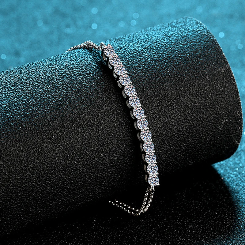 This Moissanite bracelet features a brilliant round-cut stone graded D VVS1, ensuring exceptional clarity and sparkle. Crafted from sterling silver with an 18K white gold plating, it combines durability with a luxurious finish. The adjustable chain offers a customizable fit, making it a versatile and elegant accessory for women seeking refined sophistication.