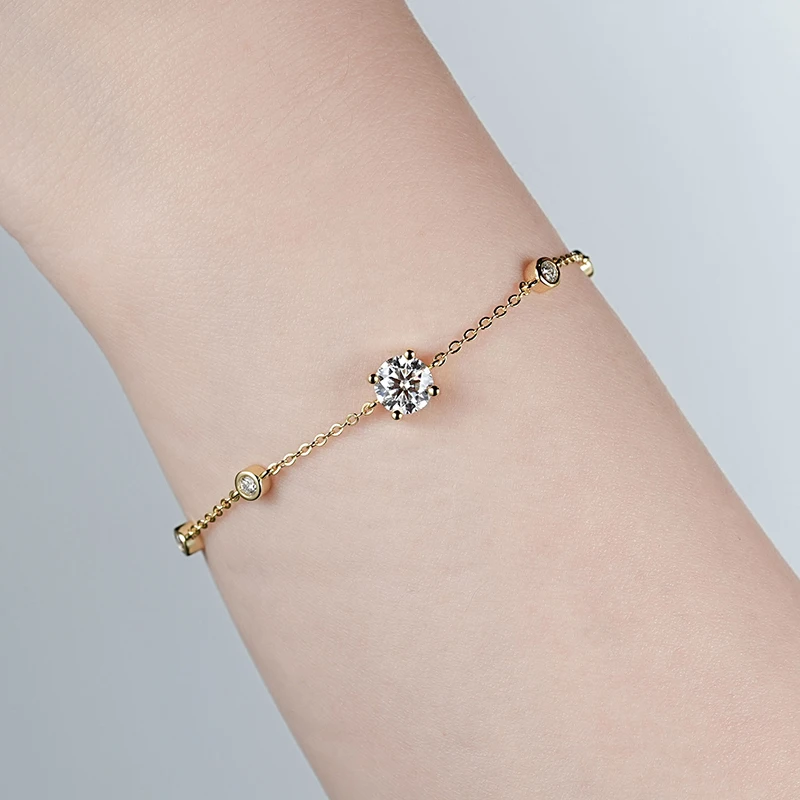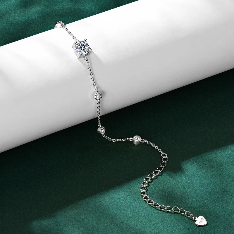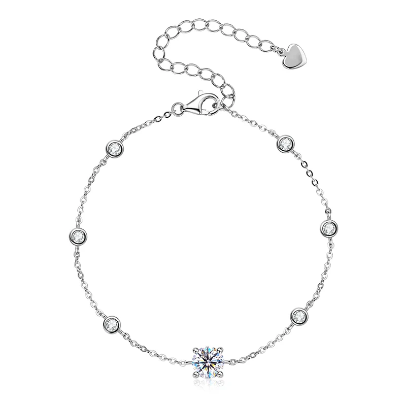 Experience timeless luxury with this exquisite moissanite bracelet, featuring seven radiant D-color stones nestled in authentic S925 sterling silver. Each gemstone is anchored by precision four-claw settings that maximize light reflection and brilliance. Composed of 100% genuine moissanite lab diamonds, this sophisticated piece rivals traditional fine jewelry in sparkle and clarity. The refined chain design effortlessly transitions from everyday wear to evening occasions, making it a versatile addition to any discerning collection. A testament to quality craftsmanship and enduring elegance.
