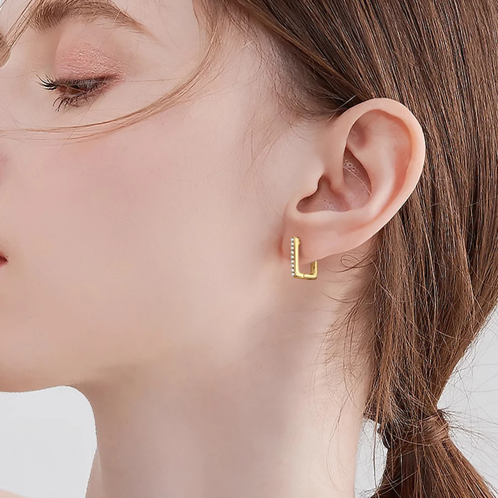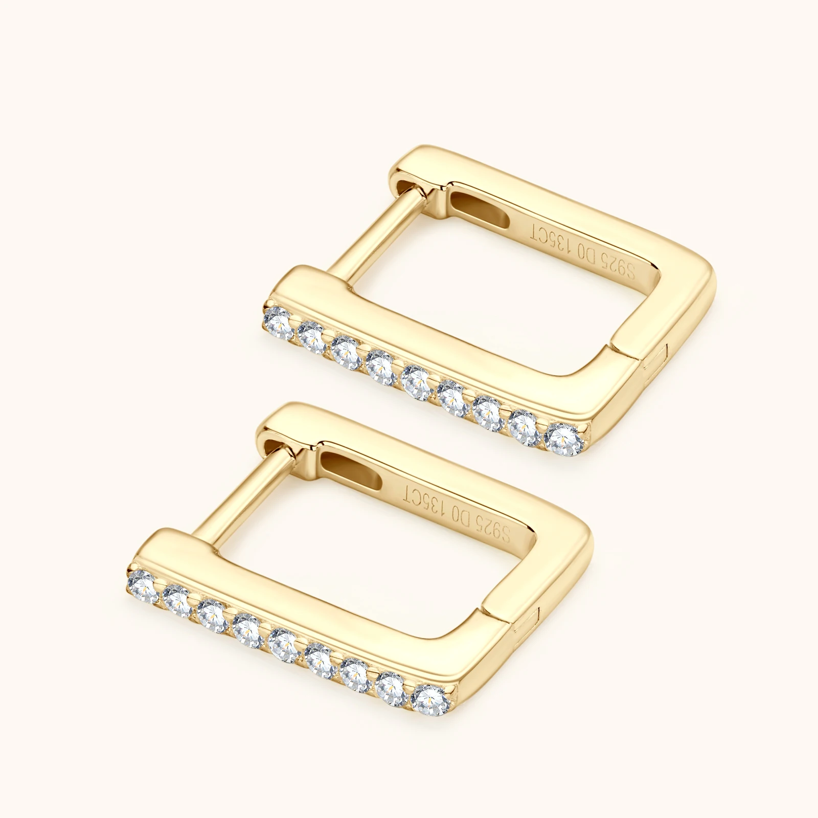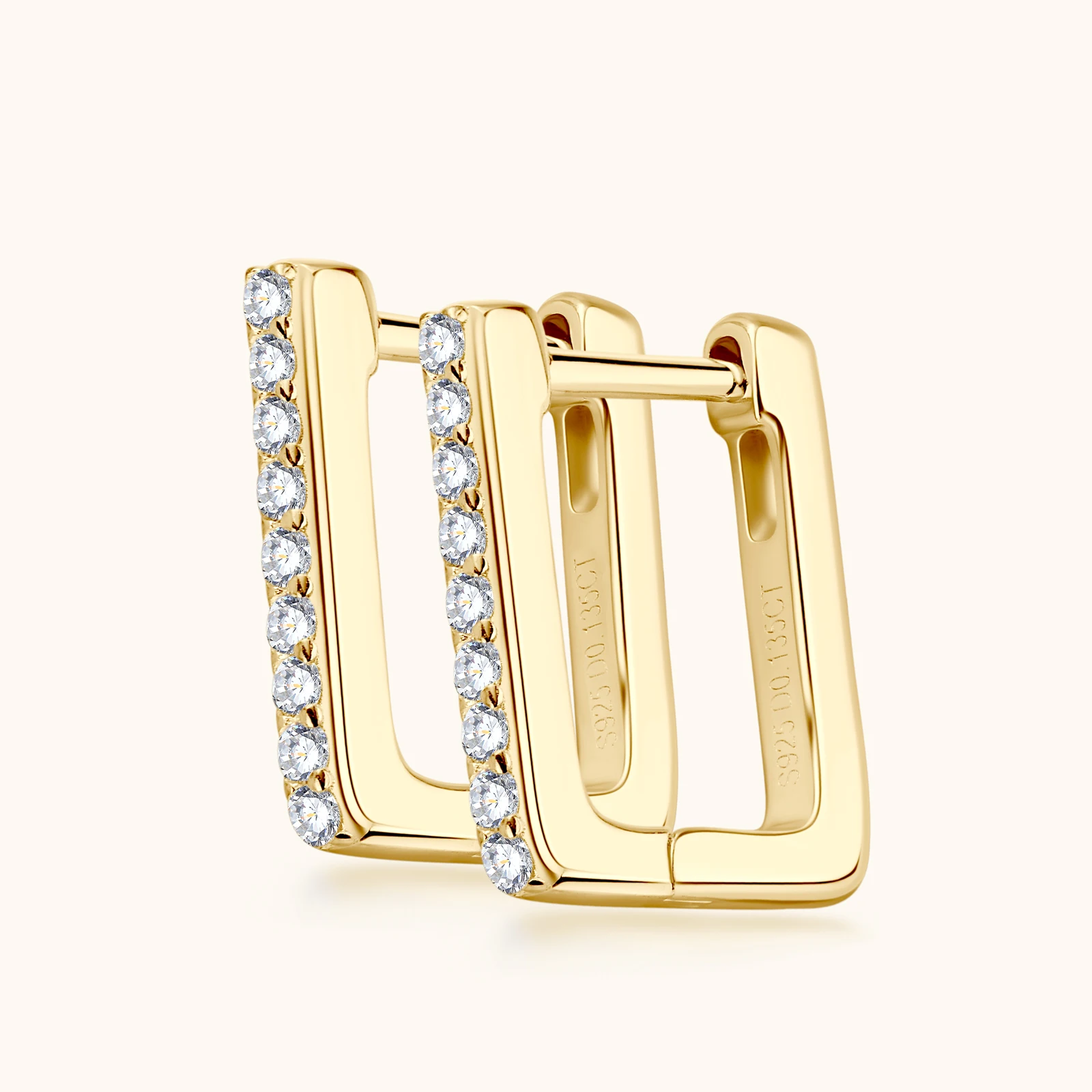 Elevate your jewelry collection with these sophisticated moissanite diamond hoop earrings, crafted from 100% genuine 925 sterling silver and finished with 18K gold plating. Featuring brilliant 1.5mm moissanite stones, these square earrings deliver exceptional sparkle and clarity that rivals traditional diamonds while offering superior durability and value. The lustrous gold-plated finish adds warmth and elegance to any complexion, making them versatile for both everyday wear and special occasions. Perfect as a meaningful gift or personal indulgence, these earrings combine expert craftsmanship with timeless design for a piece you'll treasure for years to come.