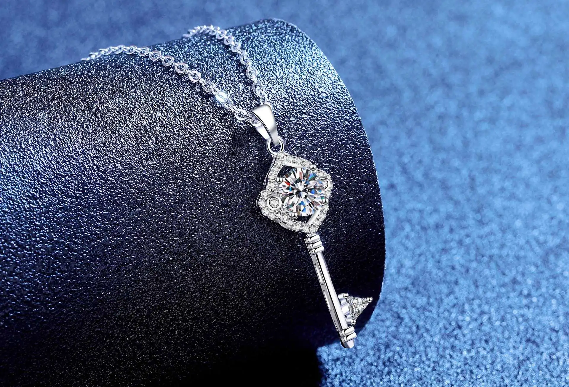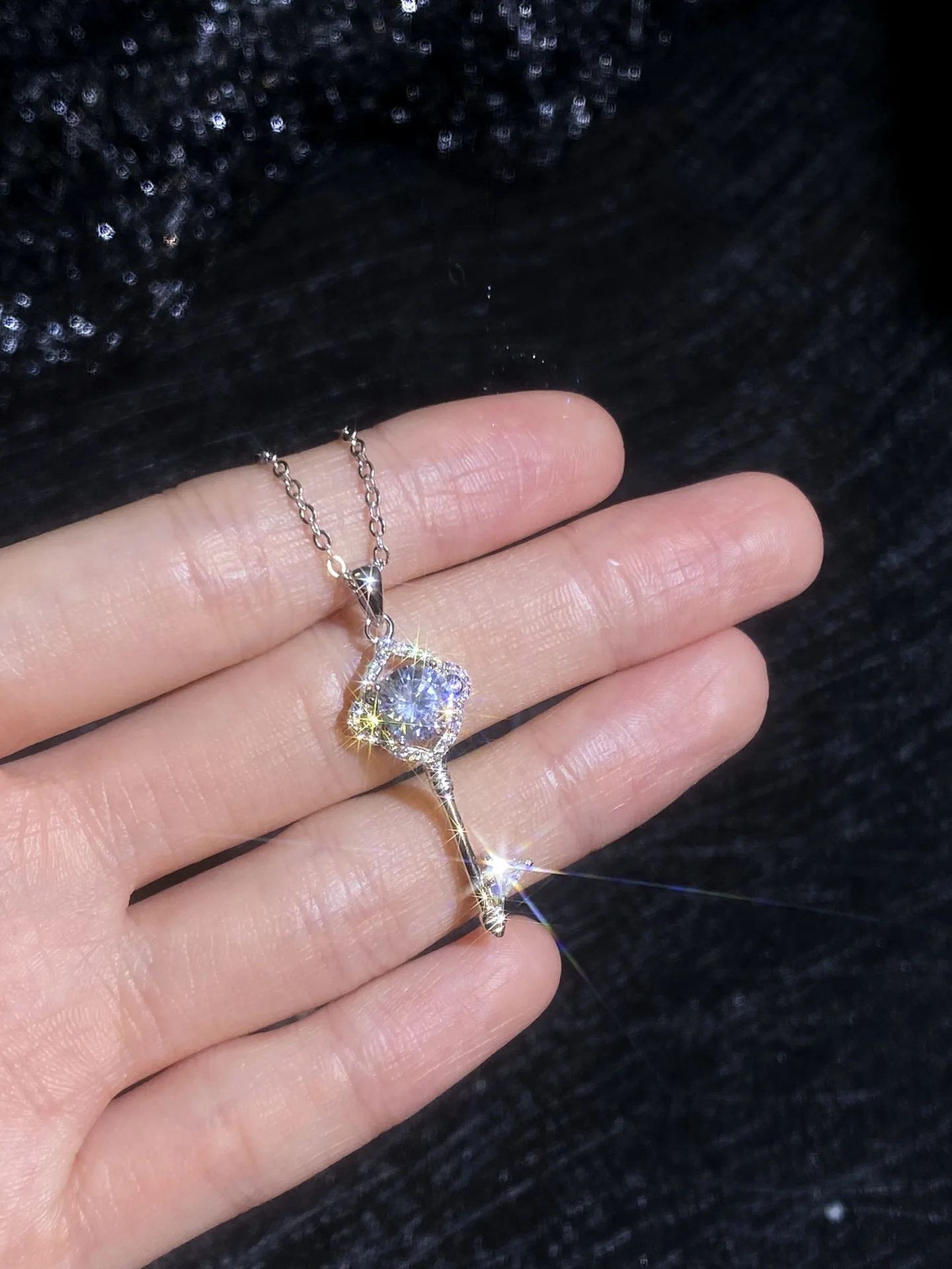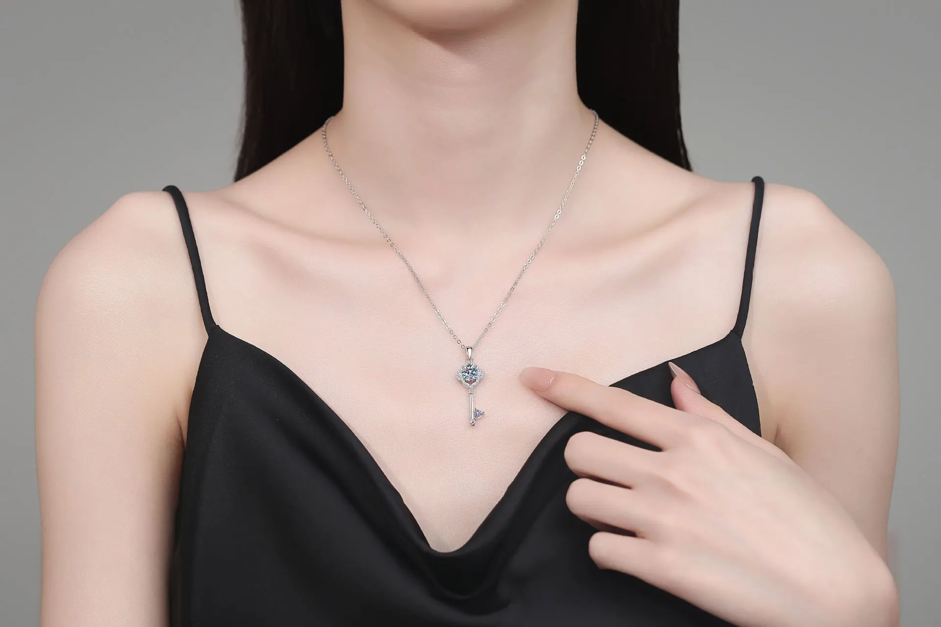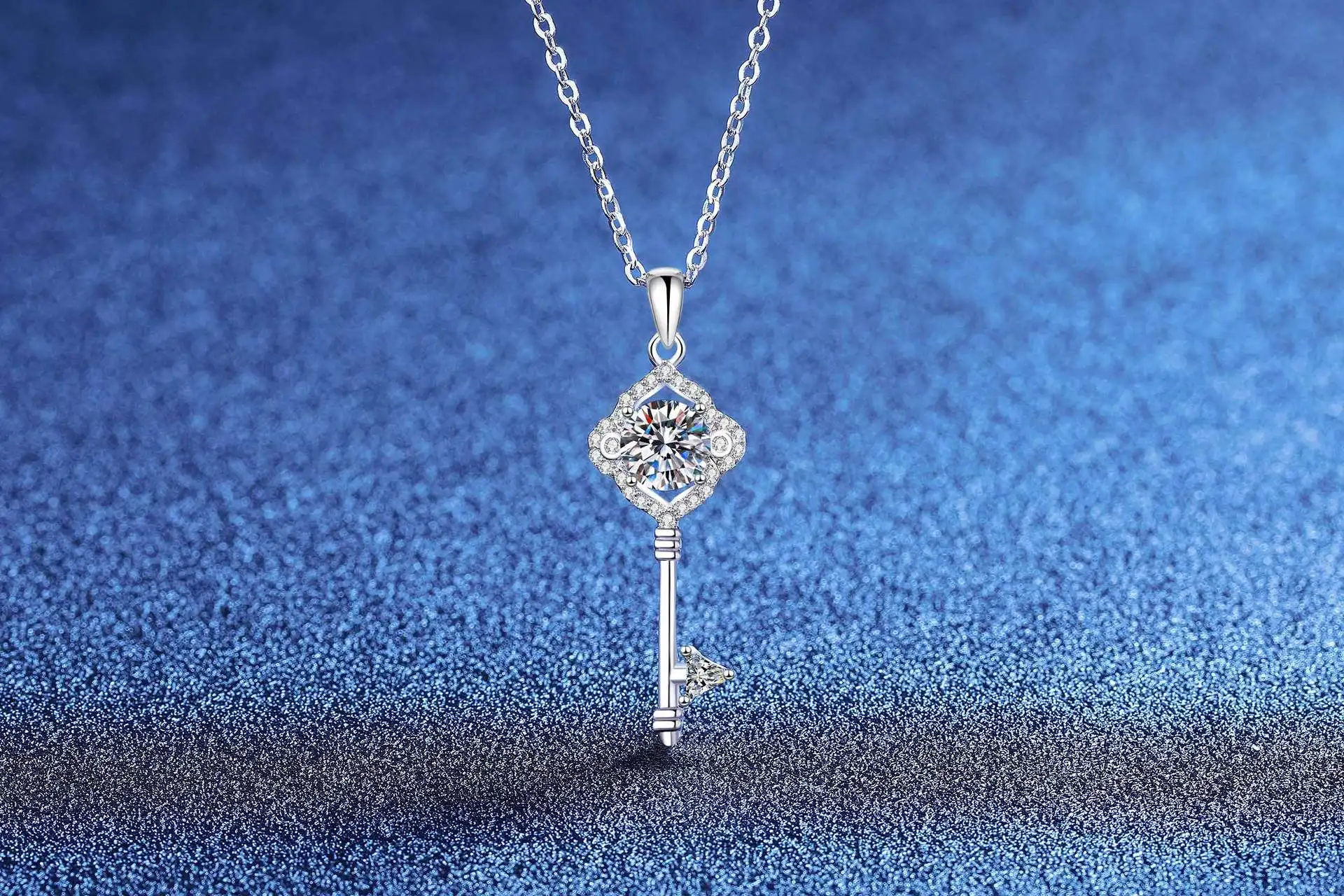 Make a bold statement with this audacious PT950 moissanite necklace that defies convention. The striking four-leaf clover key pendant commands attention with its intricate design, while the brilliant moissanite stone blazes with uncompromising sparkle and fire. Crafted in premium white gold, this Korean-inspired piece refuses to blend in—it demands to be noticed. Draped along the collarbone, it's a fearless declaration of your unique style and confidence. This isn't just jewelry; it's a power move. Own your edge with a necklace that's as daring as you are.