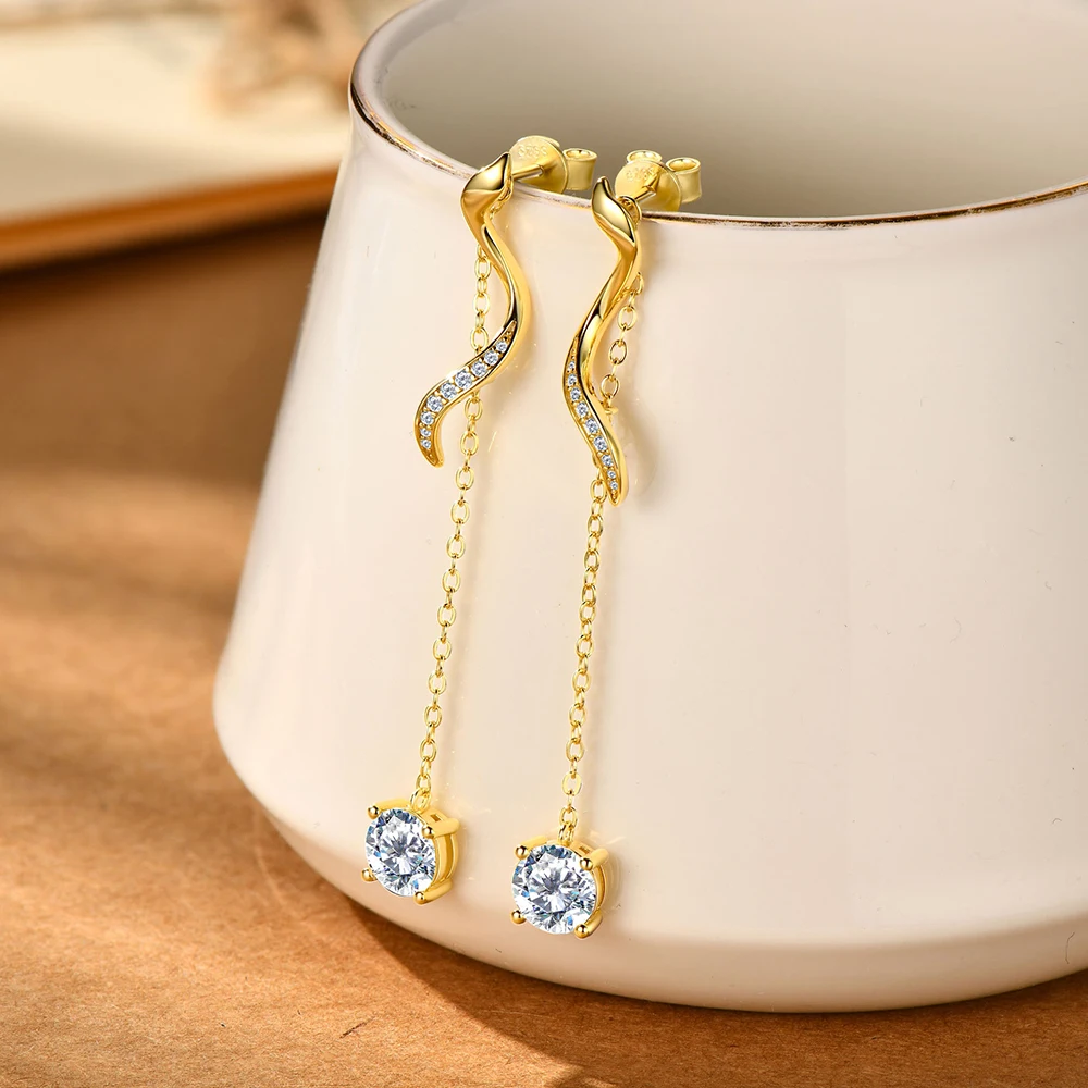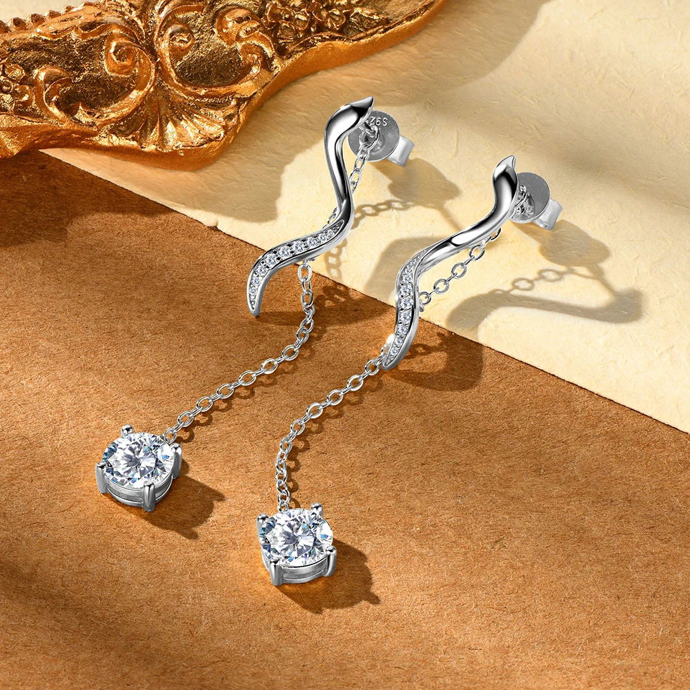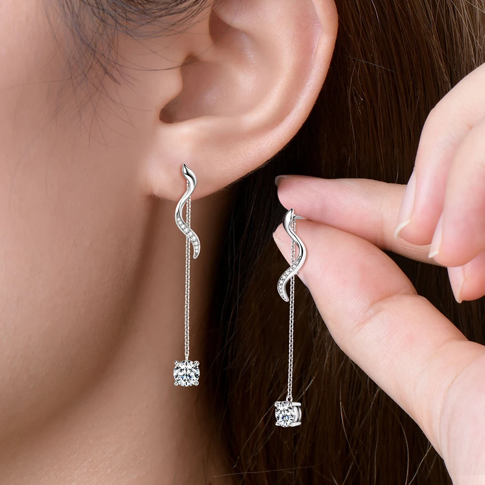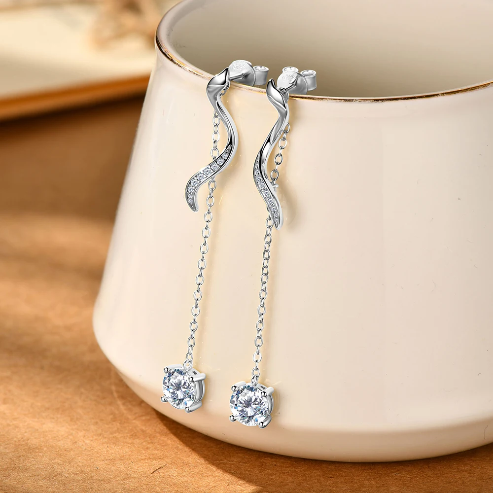 These sophisticated 1CT moissanite drop earrings combine luxury with practicality. Constructed from authentic S925 sterling silver, they feature GRA-certified moissanite stones that deliver exceptional brilliance and fire. The elongated tassel design creates an elegant silhouette that moves gracefully with every gesture, making them versatile for both formal occasions and refined everyday wear. Moissanite's superior durability ensures these earrings maintain their radiance for years to come. An excellent choice for brides, anniversaries, or anyone seeking premium jewelry that rivals traditional diamonds at a more accessible price point.