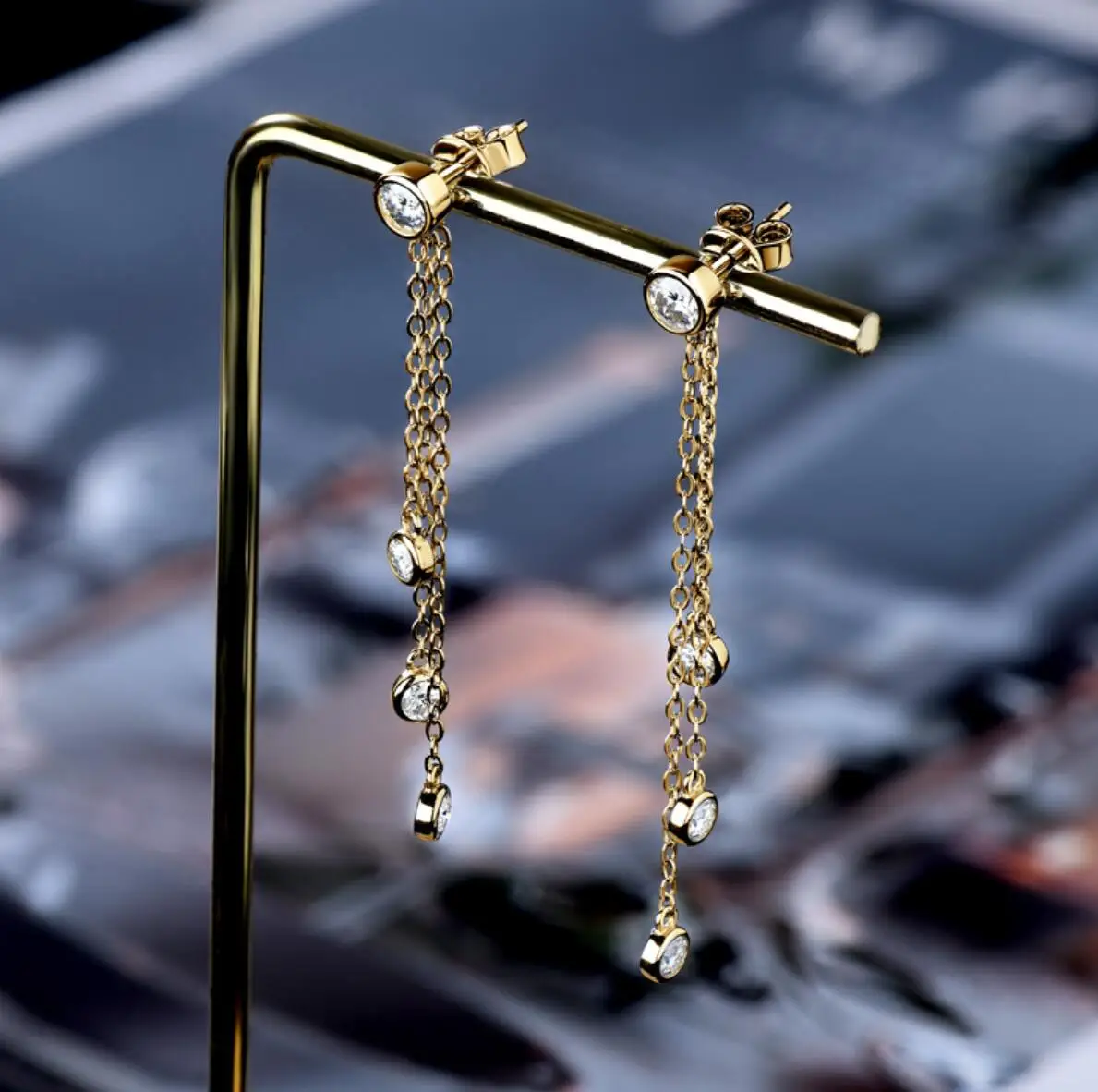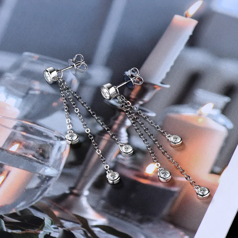 Elevate your jewelry collection with these sophisticated moissanite drop earrings, expertly crafted from 925 sterling silver with gold-filled accents. Featuring brilliant 4mm moissanite stones set in a secure bezel setting, these earrings deliver exceptional sparkle and durability comparable to diamonds at a fraction of the cost. The graceful tassel design adds movement and elegance, making them ideal for both everyday wear and special occasions. Perfect for those seeking fine jewelry that combines timeless style with modern sophistication and lasting quality.