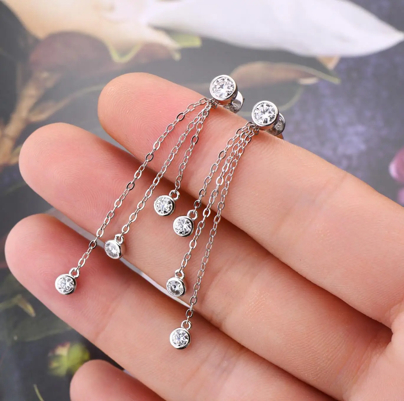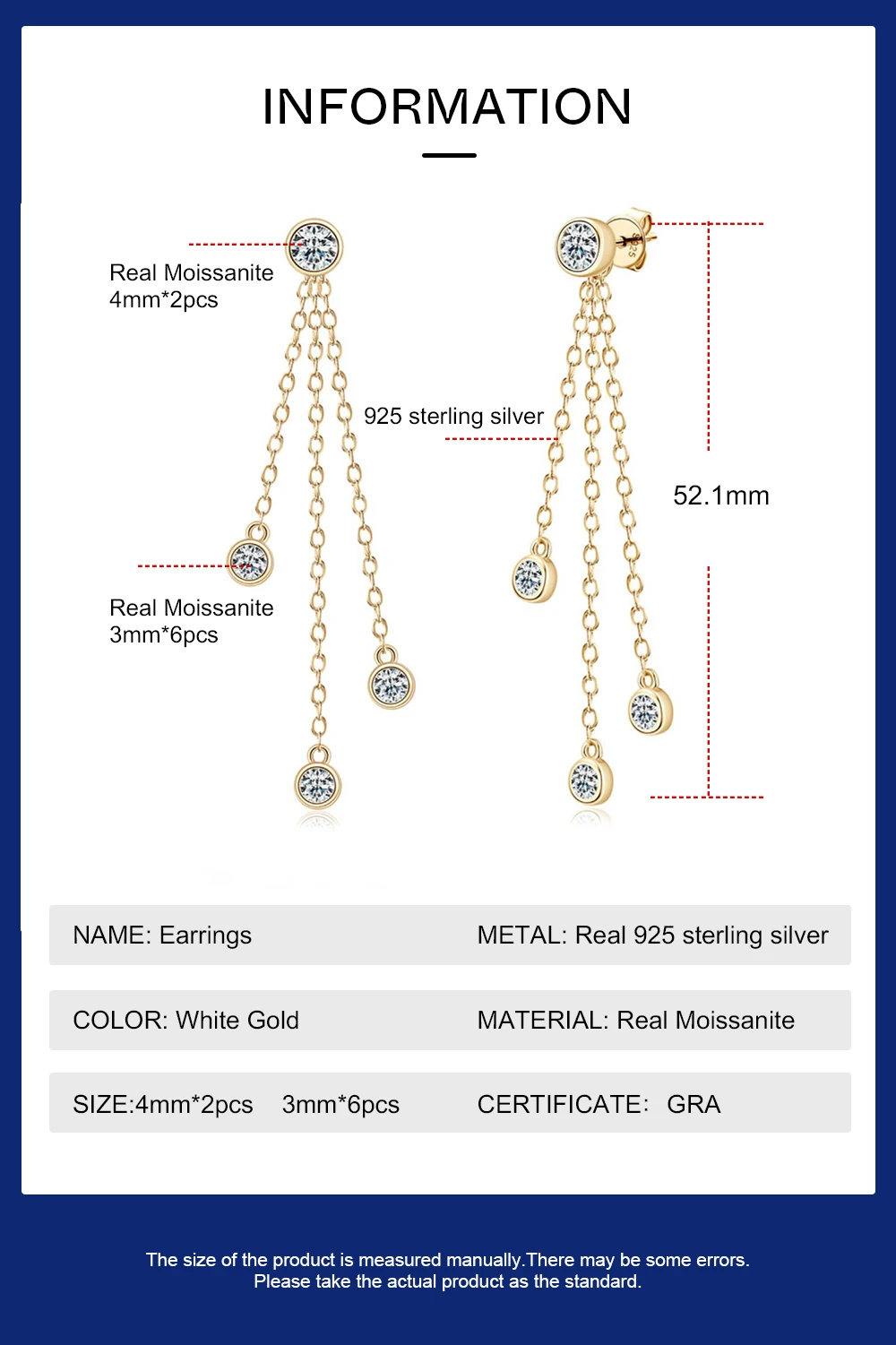 Moissanite Long Tassel Drop Earrings for Women 925 Sterling Silver Gold Filled 4mm Bezel Diamond Earring Fine Jewelry