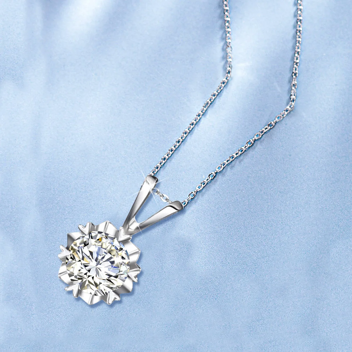 This exquisite necklace features a genuine moissanite gemstone available in 1ct, 2ct, or 3ct, certified to test positive for authenticity. Crafted from 925 sterling silver, the snowflake design combines timeless elegance with modern appeal. Perfect for weddings or special occasions, this piece offers lasting durability and brilliant sparkle to complement any ensemble with refined sophistication.
