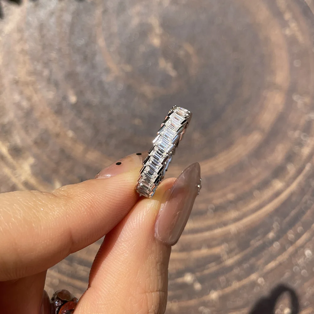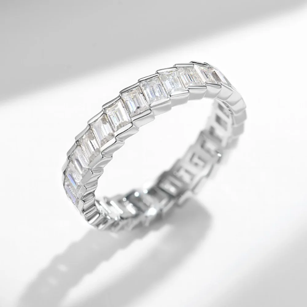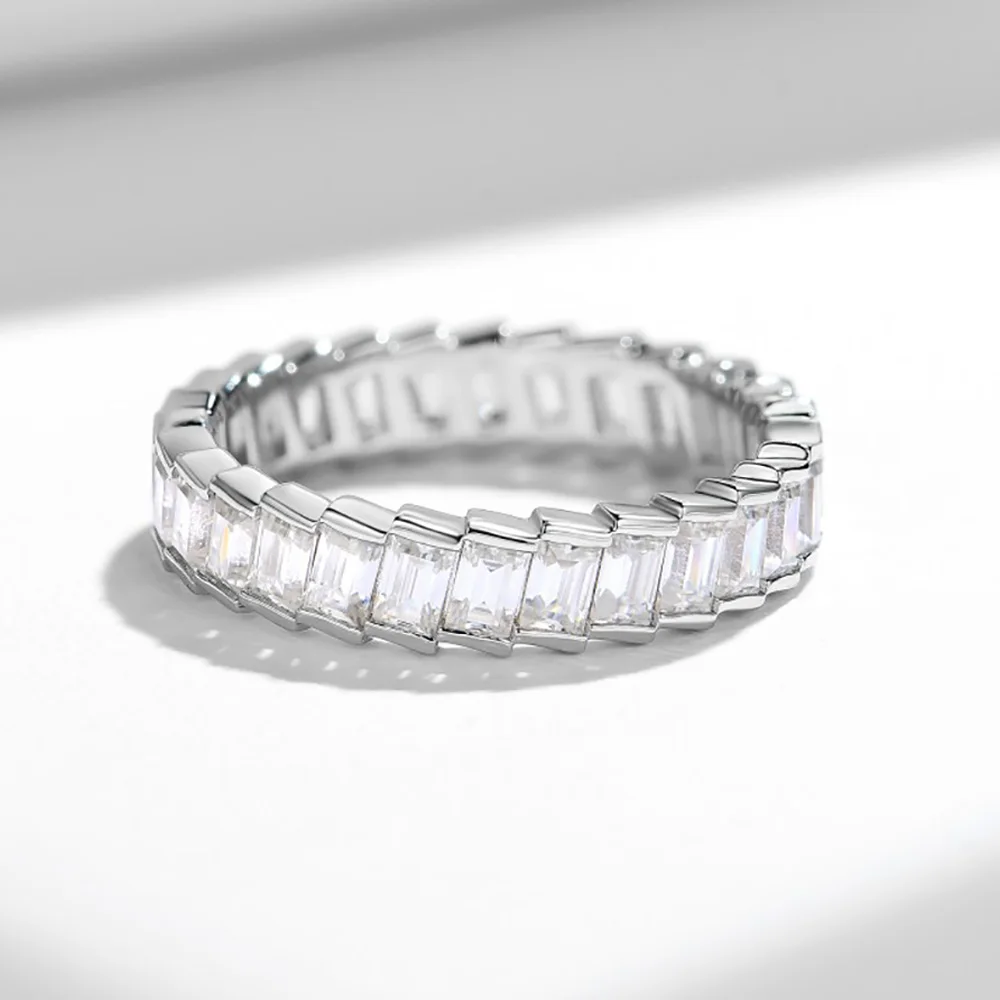 This exquisite women's eternity ring features a 4.3ct total weight of dazzling emerald cut moissanite stones in rare D color, offering exceptional brilliance closely resembling high-grade diamonds. Crafted from 100% S925 sterling silver and plated with 18K gold, the ring ensures lasting quality and elegance. Perfect as a meaningful gift, its timeless design and durable materials make it ideal for daily wear or special occasions, combining sophisticated style with expert craftsmanship.