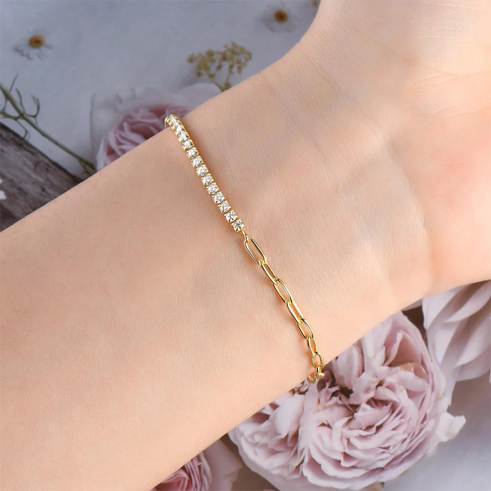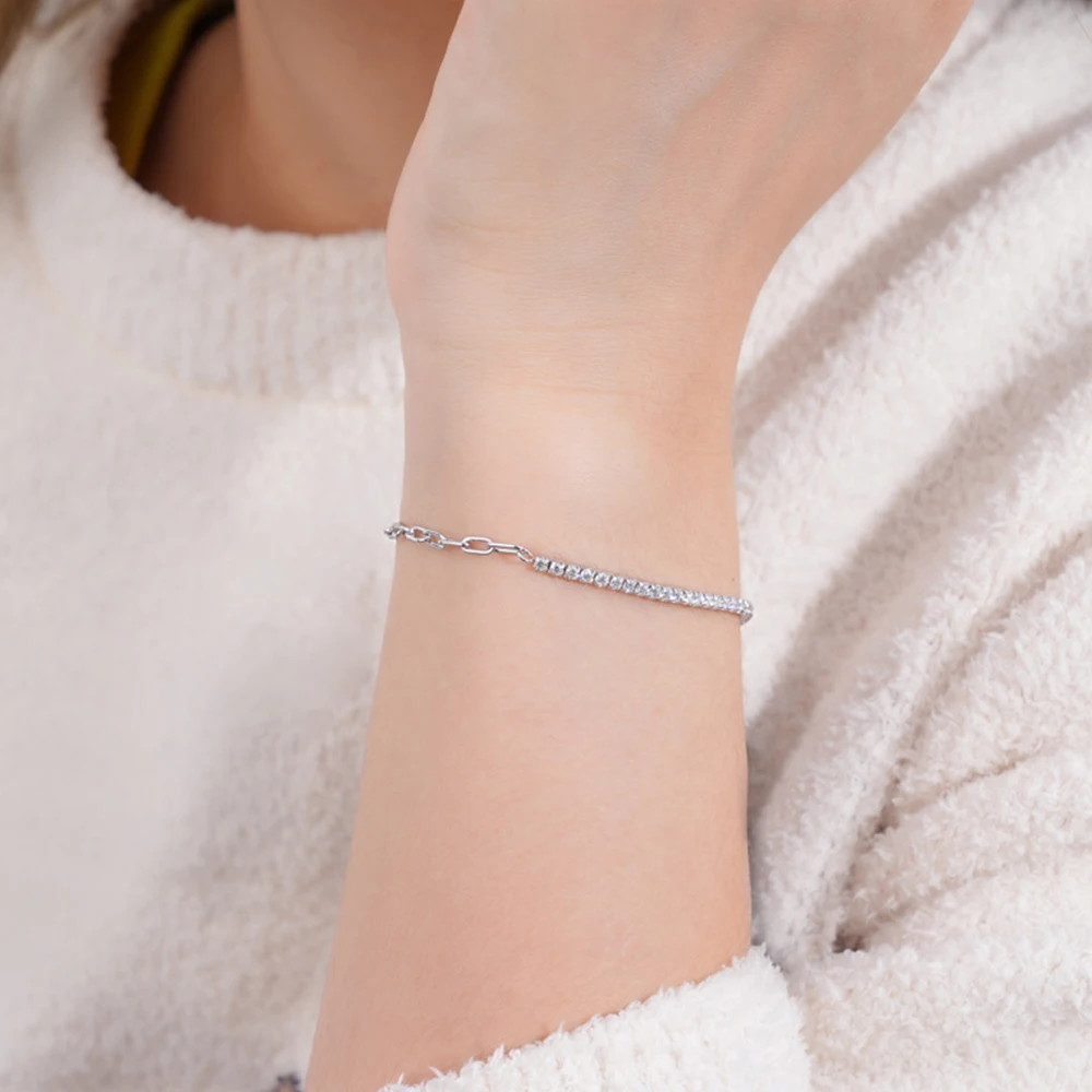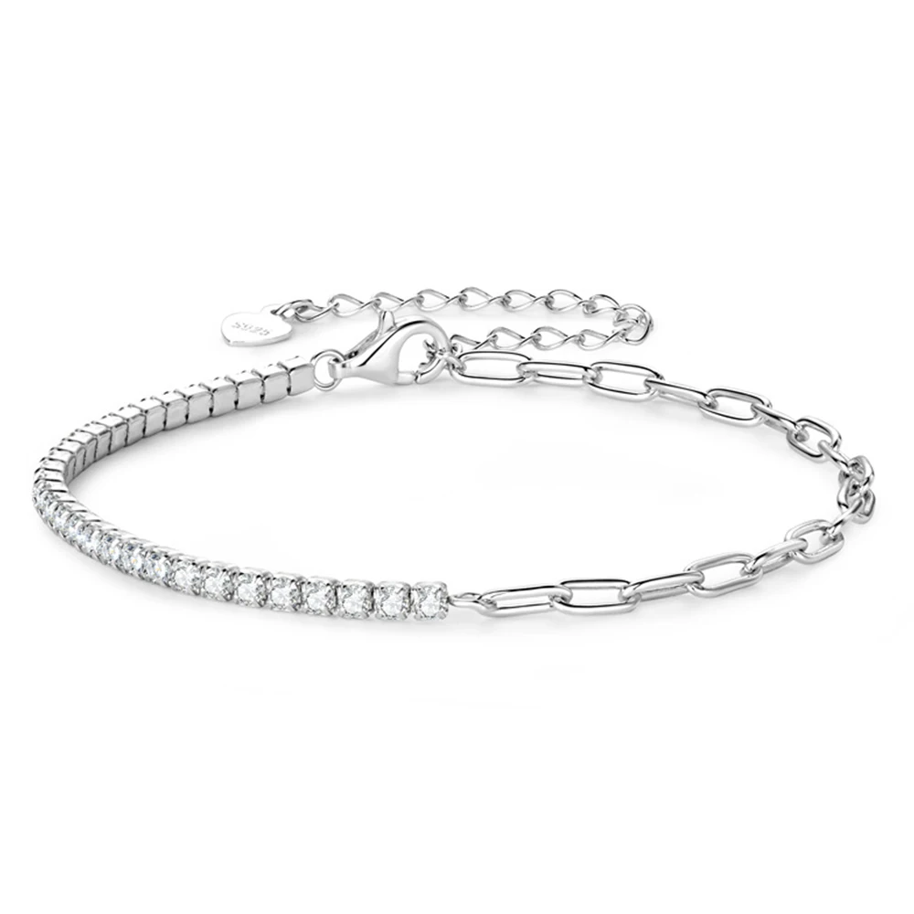 Expertly crafted with 2mm Moissanite stones, this luxurious tennis bracelet is made of high-quality 925 Sterling Silver. The stylish chain design adds a trendy touch, making it the perfect accessory for any outfit. Give the gift of elegance with this timeless piece of jewelry.