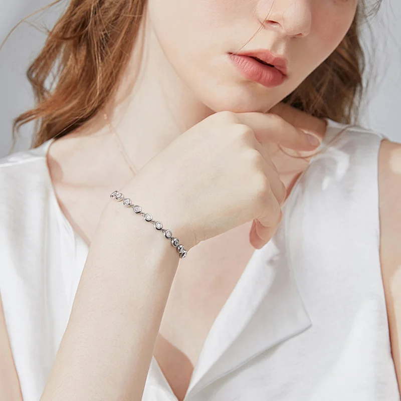 This 3mm Moissanite tennis bracelet is expertly crafted from GRA-certified stones set in durable s925 sterling silver. The dainty bezel setting beautifully secures each sparkling gem, offering both elegance and lasting wear. Its refined design makes it an ideal choice for weddings or everyday sophistication, providing exceptional brilliance with a versatile, timeless appeal.