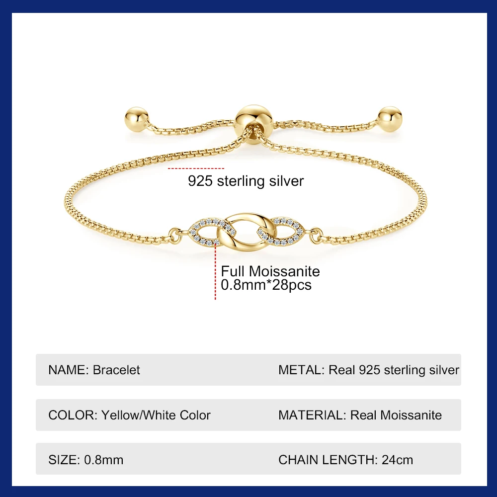 New Moissanite Bracelets for Women 18K Gold Plated 925 Sterling Silver Infinity Adjustable Bracelet Fine Jewelry Gift