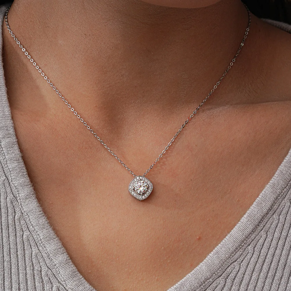 This exquisite pendant features a brilliant 1-carat moissanite stone set in premium 18k white gold, delivering exceptional sparkle and clarity at a fraction of traditional diamond costs. The sophisticated square design showcases the stone's radiance while maintaining timeless elegance. Crafted with Pt950 platinum accents for enhanced durability and luxury, this necklace makes an ideal choice for weddings, engagements, or milestone celebrations. The refined aesthetic suits both everyday wear and formal occasions, offering versatile sophistication for the discerning jewelry collector. A stunning investment piece that combines fine craftsmanship with enduring beauty.