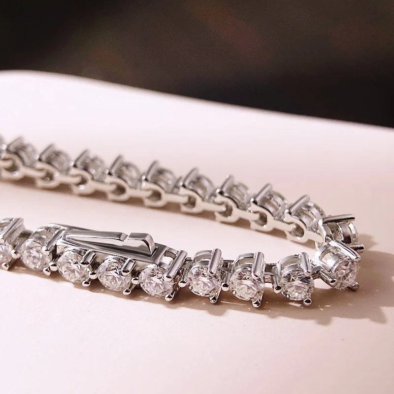 This GRA-certified moissanite tennis bracelet showcases exceptional craftsmanship with VVS1-grade stones set in authentic s925 sterling silver and finished with 18k white gold plating. Each 3mm moissanite is secured in a three-claw setting, ensuring optimal light performance and durability. The continuous line of brilliantly cut stones creates a striking visual impact suitable for both formal occasions and refined everyday wear. Moissanite's superior hardness and optical properties make it an excellent alternative to traditional diamonds, offering lasting beauty without compromise. Ideal for discerning jewelry enthusiasts seeking quality, authenticity, and enduring elegance.