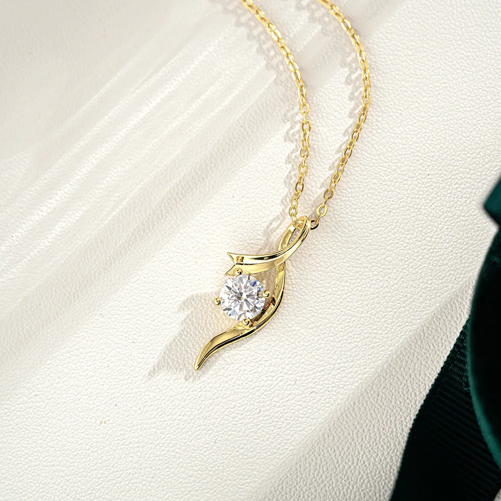 Make a lasting impression with this captivating moissanite necklace, where luxury meets affordability. The 1-carat VVS D Color stone radiates unmatched brilliance, set gracefully in 14K gold with an artfully twisted pendant design that catches light from every angle. This fine jewelry piece transcends trends—equally stunning as a wedding day treasure or an everyday indulgence. Moissanite's renowned durability means your necklace will maintain its pristine sparkle through years of cherished moments. Invest in a piece that celebrates your style, marks your milestones, and becomes the jewelry you'll reach for again and again.